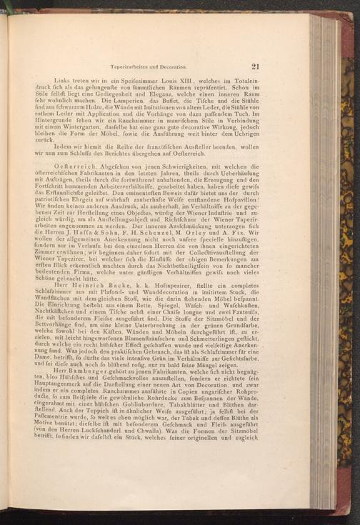 Oefterreich. Abgefehen von jenen Schwierigkeiten, mit welchen die öfterreichifchen Fabrikanten in den letzten Jahren, theils durch Ueberhäufung mit Aufträgen, theils durch die fortwährend anhaltenden, die Erzeugung und den Fortfchritt hemmenden Arbeiterverhältniffe, gearbeitet haben, haben diefe gewiſs das Erftaunlichfte geleiftet. Den eminenteften Beweis dafür bietet uns der durch patriotifchen Ehrgeiz auf wahrhaft zauberhafte Weife entstandene Hofpavillon! Wir finden keinen anderen Ausdruck, als zauberhaft, im Verhältniffe zu der gegebenen Zeit zur Herftellung eines Objectes, würdig der Wiener Induſtrie und zugleich würdig, um als Ausftellungsobject und Richtfchnur der Wiener Tapezirarbeiten angenommen zu werden. Der inneren Ausfchmückung unterzogen fich die Herren J. Haffa& Sohn, F. H. Schenzel, M. Orley und A. Fix. Wir wollen der allgemeinen Anerkennung nicht noch unfere fpecielle hinzufügen, fondern nur im Verlaufe bei den einzelnen Herren die von ihnen eingerichteten Zimmer erwähnen; wir beginnen daher fofort mit der Collecttivausftellung der Wiener Tapezirer, bei welcher fich die Einflüffe der obigen Bemerkungen am erften Blick erkenntlich machten durch das Nichtbetheiligtfein von fo mancher bedeutenden Firma, welche unter günftigen Verhältniffen gewifs noch vieles Schöne gebracht hätte.
