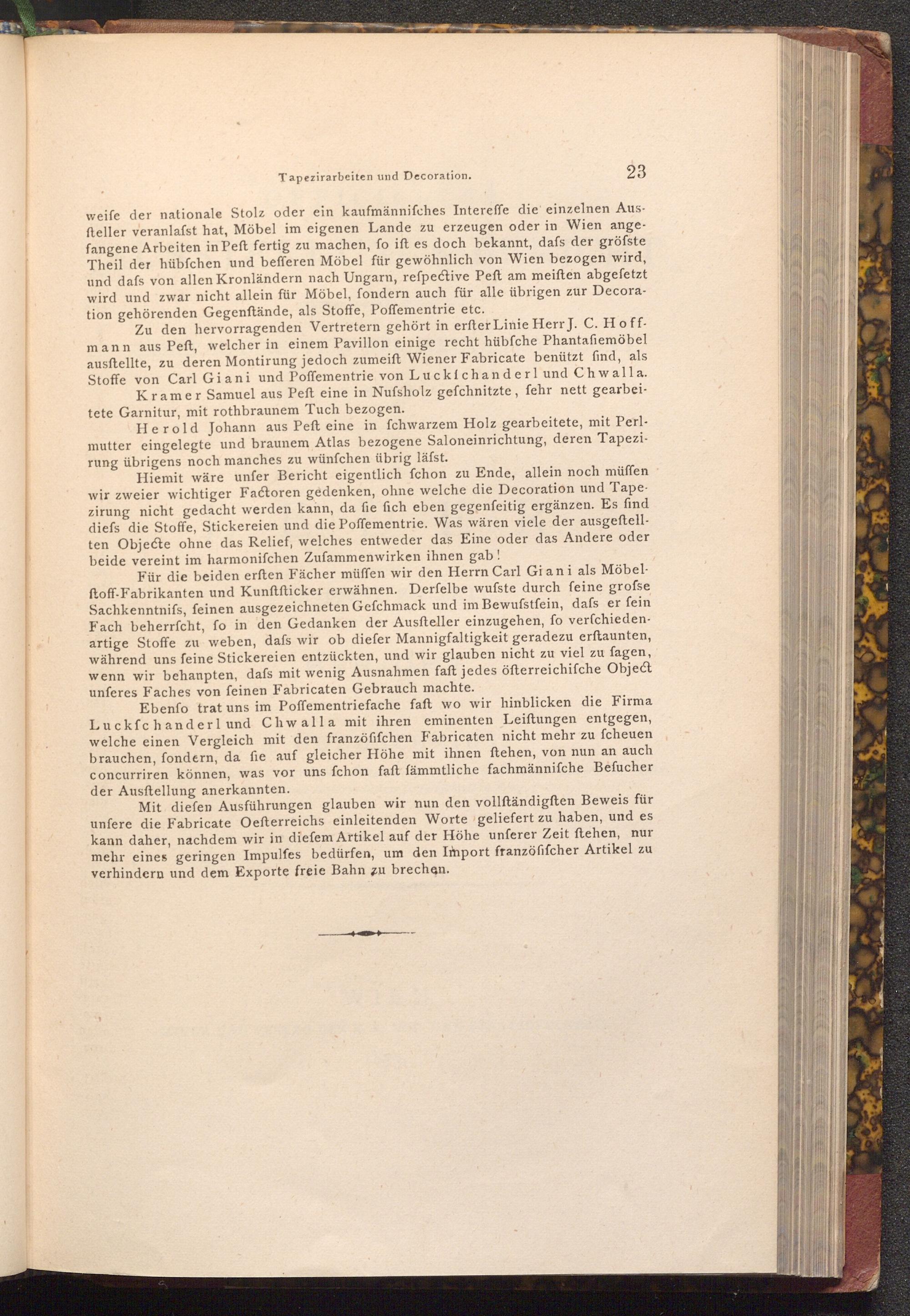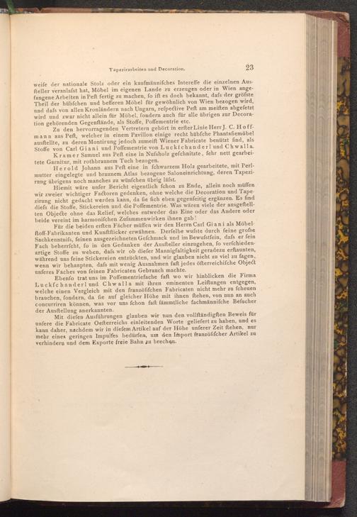 Ebenfo trat uns im Poffementriefache faft wo wir hinblicken die Firma Luckfchanderlund Chwalla mit ihren eminenten Leiftungen entgegen, welche einen Vergleich mit den franzöfifchen Fabricaten nicht mehr zu fcheuen brauchen, fondern, da fie auf gleicher Höhe mit ihnen ftehen, von nun an auch concurriren können, was vor uns fchon faft fämmtliche fachmännische Befucher der Ausftellung anerkannten.