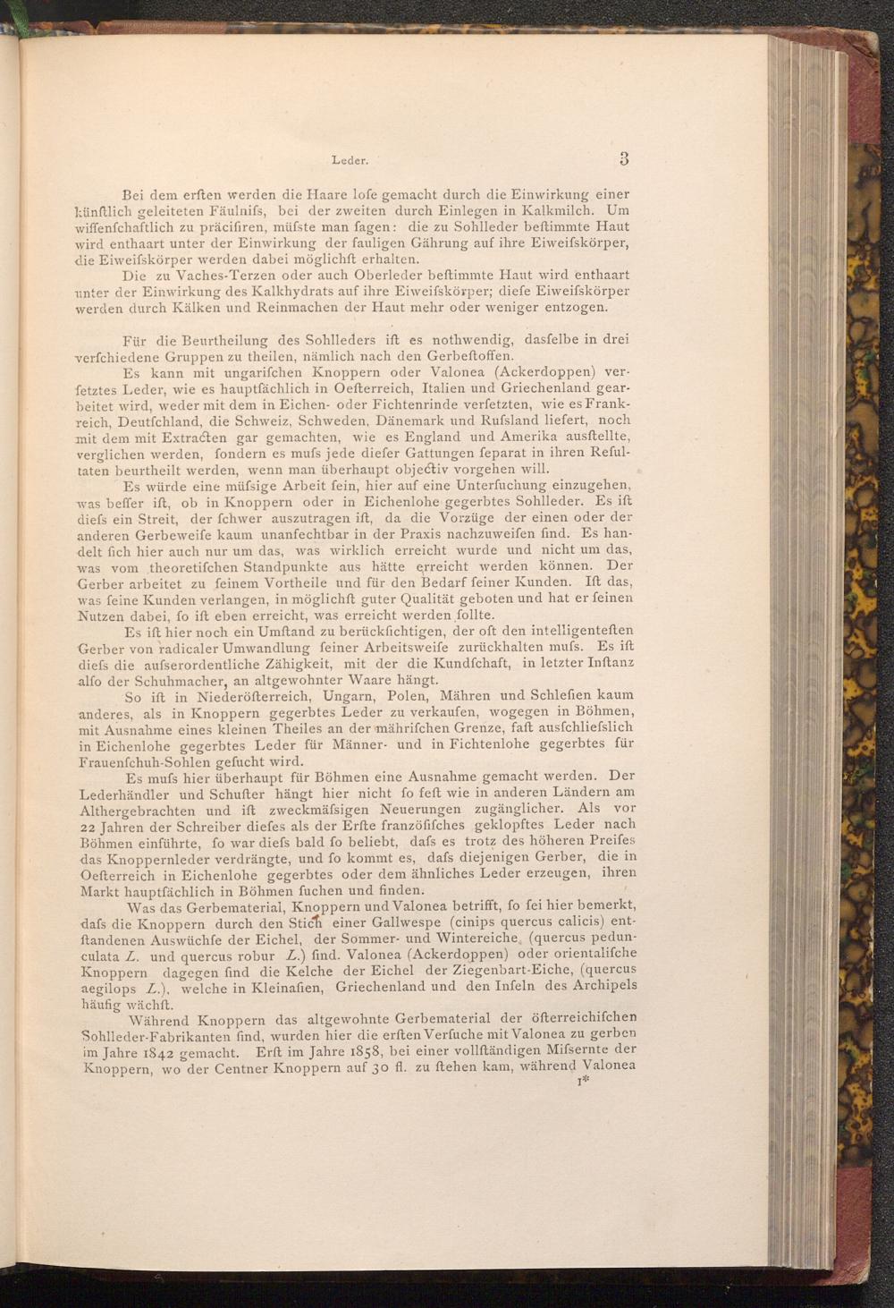 Es mufs hier überhaupt für Böhmen eine Ausnahme gemacht werden. Der Lederhändler und Schufter hängt hier nicht fo feft wie in anderen Ländern am Althergebrachten und ift zweckmäfsigen Neuerungen zugänglicher. Als vor 22 Jahren der Schreiber diefes als der Erfte franzöfifches geklopftes Leder nach Böhmen einführte, fo war diefs bald fo beliebt, dafs es trotz des höheren Preifes die in das Knoppernleder verdrängte, und fo kommt es, dafs diejenigen Gerber, Oefterreich in Eichenlohe gegerbtes oder dem ähnliches Leder erzeugen, ihren Markt hauptfächlich in Böhmen fuchen und finden.