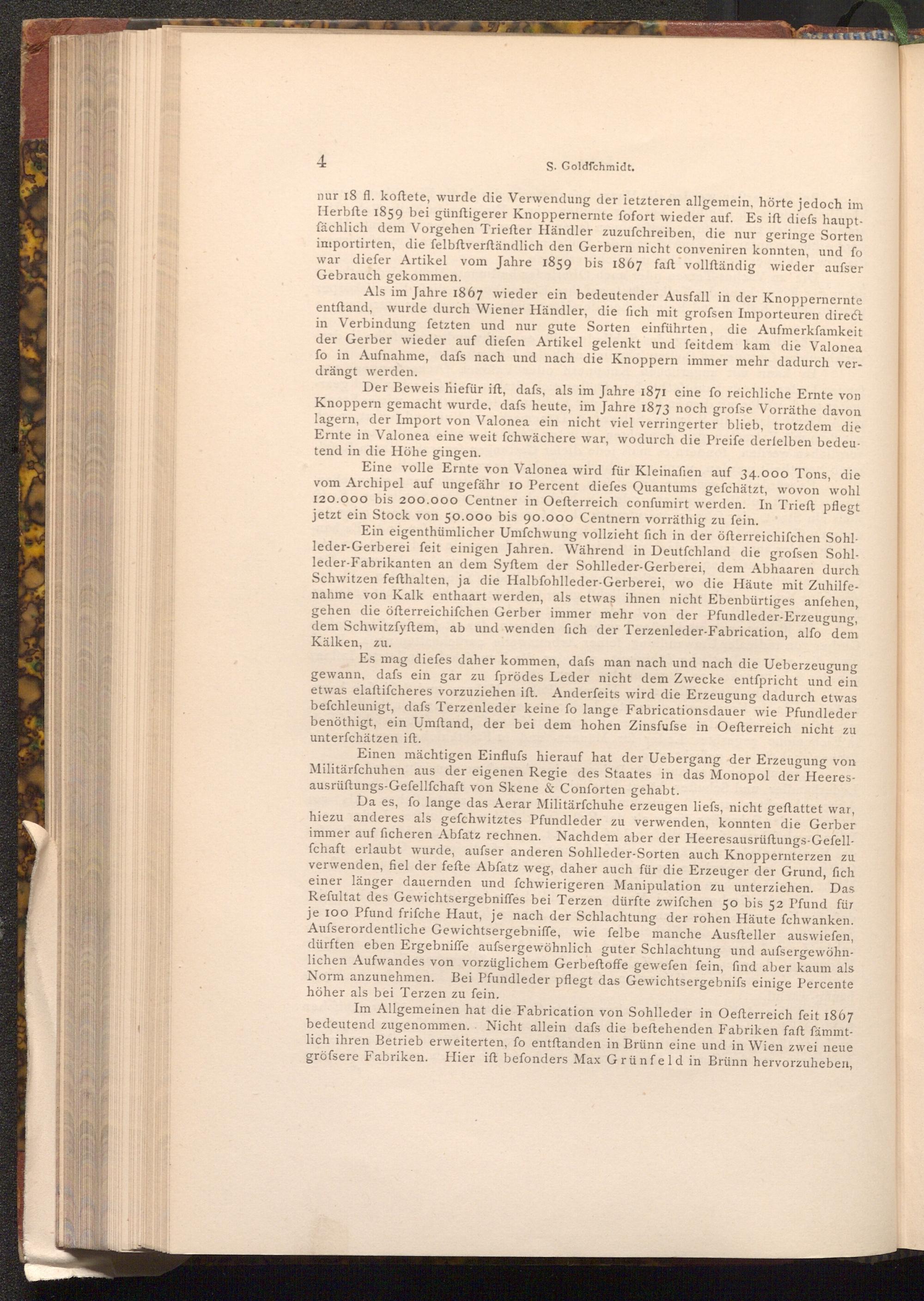 Ein eigenthümlicher Umfchwung vollzieht fich in der öfterreichifchen Sohlleder- Gerberei feit einigen Jahren. Während in Deutſchland die grofsen Sohlleder- Fabrikanten an dem Syftem der Sohlleder- Gerberei, dem Abhaaren durch Schwitzen fefthalten, ja die Halbfohlleder- Gerberei, wo die Häute mit Zuhilfenahme von Kalk enthaart werden, als etwas ihnen nicht Ebenbürtiges anfehen, gehen die öfterreichiſchen Gerber immer mehr von der Pfundleder- Erzeugung, dem Schwitzfyftem, ab und wenden fich der Terzenleder- Fabrication, alfo dem Kälken, zu.