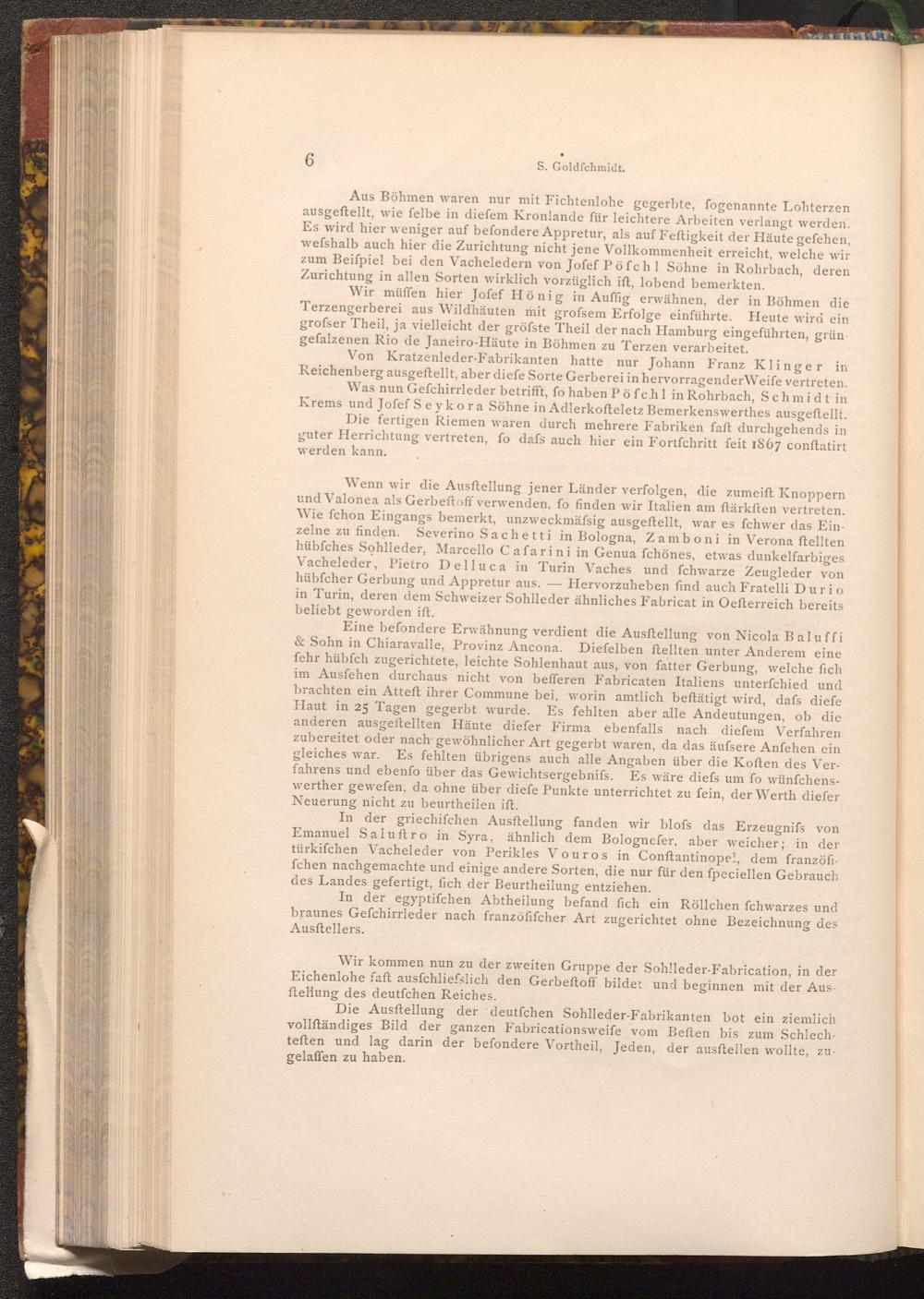 Wenn wir die Ausstellung jener Länder verfolgen, die zumeift Knoppern und Valonea als Gerbeftoff verwenden, fo finden wir Italien am ftärksten vertreten. Wie fchon Eingangs bemerkt, unzweckmäfsig ausgeftellt, war es fchwer das Einzelne zu finden. Severino Sachetti in Bologna, Zamboni in Verona ftellten hübfches Sohlleder, Marcello Cafarini in Genua fchönes, etwas dunkelfarbiges Vacheleder, Pietro Delluca in Turin Vaches und fchwarze Zeugleder von hübfcher Gerbung und Appretur aus. Hervorzuheben find auch Fratelli Durio in Turin, deren dem Schweizer Sohlleder ähnliches Fabricat in Oefterreich bereits beliebt geworden ift.