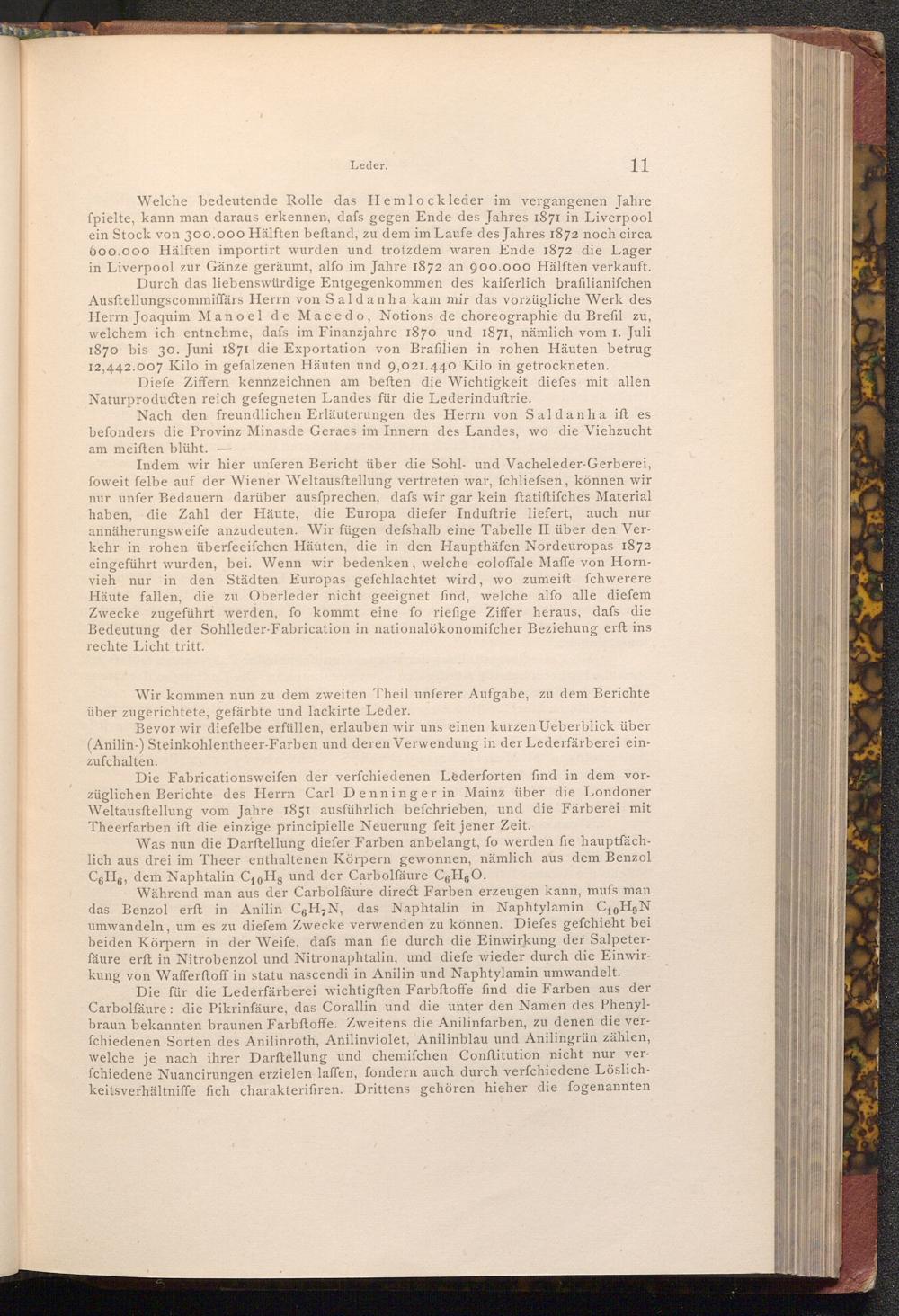 Welche bedeutende Rolle das Hemlock leder im vergangenen Jahre ſpielte, kann man daraus erkennen, dafs gegen Ende des Jahres 1871 in Liverpool ein Stock von 300.000 Hälften beftand, zu dem im Laufe des Jahres 1872 noch circa 600.000 Hälften importirt wurden und trotzdem waren Ende 1872 die Lager in Liverpool zur Gänze geräumt, alfo im Jahre 1872 an 900.000 Hälften verkauft. Durch das liebenswürdige Entgegenkommen des kaiferlich brafilianifchen Ausftellungscommiffärs Herrn von Saldanha kam mir das vorzügliche Werk des Herrn Joaquim Manoel de Macedo, Notions de choreographie du Brefil zu, welchem ich entnehme, dafs im Finanzjahre 1870 und 1871, nämlich vom 1. Juli 1870 bis 30. Juni 1871 die Exportation von Brafilien in rohen Häuten betrug 12,442.007 Kilo in gefalzenen Häuten und 9,021.440 Kilo in getrockneten.