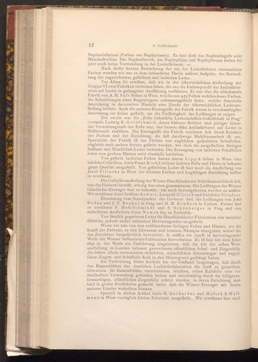 Die Collectivausftellung der Wiener Handfchuhleder- Fabrikanten fchlofs fich, was die Färberei betrifft, würdig den oben genannten an. Die Leiftungen der Wiener Glacéleder- Erzeuger find zu bekannt, um noch hervorgehoben werden zu müffen. Wir erwähnen hier Chriftian Arwart, Leopold Ullrich und Gebrüder Strafser. Ebenbürtig vom Standpunkte der Gerberei find die Leiftungen von Jofef Budan und J. U. Benker in Prag und H. M. Eckstein in Lieben. Ferner find zu erwähnen F. Mehlfchmiedt und S. Schönberger in Prag und von mährifchen Ausftellern Peter Nowak fen. in Trebitfch.