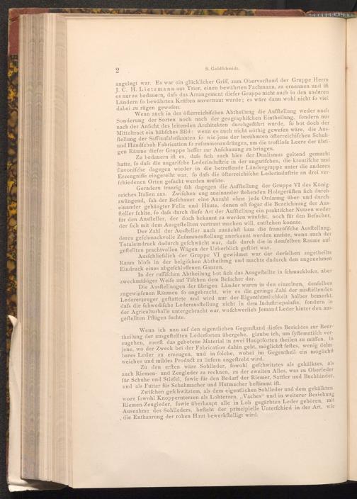 Wenn auch in der öfterreichifchen Abtheilung die Aufftellung weder nach Sonderung der Sorten noch nach der geographifchen Eintheilung, fondern nur nach der Anficht des leitenden Architekten durchgeführt wurde, fo bot doch der Mitteltract ein hübfches Bild: wenn es auch nicht nöthig gewefen wäre, die Ausftellung der Saffianfabrikanten fo wie jene der berühmten öfterreichifchen Schuhund Handfchuh- Fabrication fo zufammenzudrängen, um die troftlofe Leere der übrigen Räume diefer Gruppe beffer zur Anfchauung zu bringen.