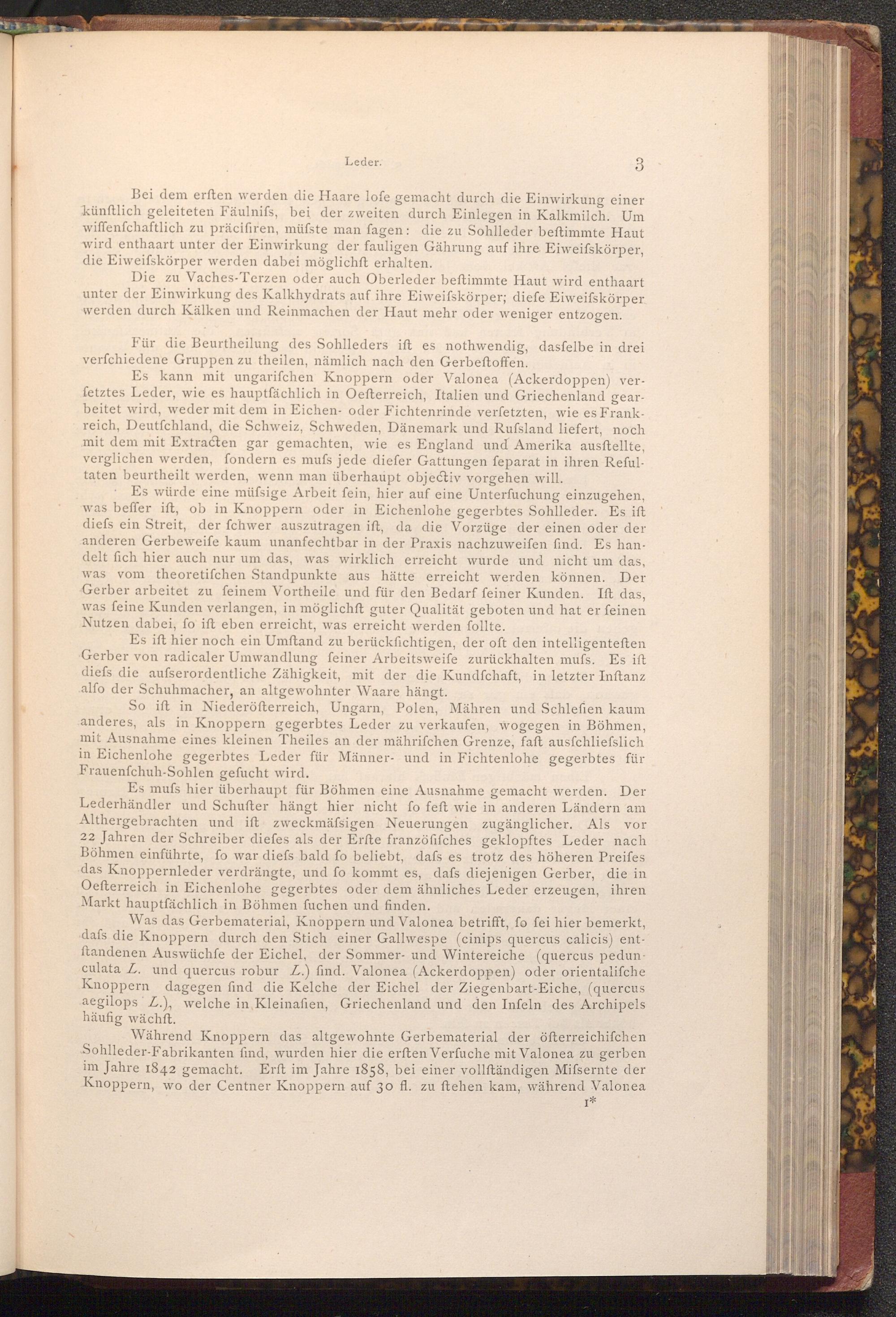 Es mufs hier überhaupt für Böhmen eine Ausnahme gemacht werden. Der Lederhändler und Schufter hängt hier nicht fo feft wie in anderen Ländern am Althergebrachten und ist zweckmässigen Neuerungen zugänglicher. Als 22 Jahren der Schreiber diefes als der Erfte franzöfifches geklopftes Leder nach Böhmen einführte, fo war diefs bald fo beliebt, dafs es trotz des höheren Preifes das Knoppernleder verdrängte, und fo kommt es, dafs diejenigen Gerber, die in Oefterreich in Eichenlohe gegerbtes oder dem ähnliches Leder erzeugen, ihren Markt hauptfächlich in Böhmen fuchen und finden.