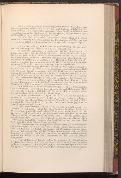Es kann mit ungarifchen Knoppern oder Valonea( Ackerdoppen) verfetztes Leder, wie es hauptfächlich in Oefterreich, Italien und Griechenland gearbeitet wird, weder mit dem in Eichen- oder Fichtenrinde verfetzten, wie es Frankreich, Deutfchland, die Schweiz, Schweden, Dänemark und Rufsland liefert, noch mit dem mit Extracten gar gemachten, wie es England und Amerika ausftellte, verglichen werden, fondern es mufs jede diefer Gattungen feparat in ihren Refultaten beurtheilt werden, wenn man überhaupt objectiv vorgehen will.