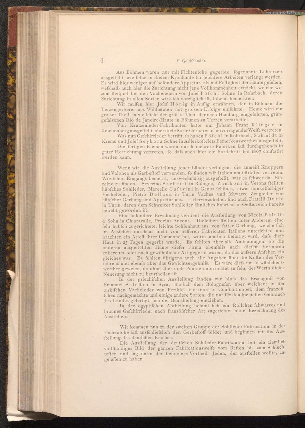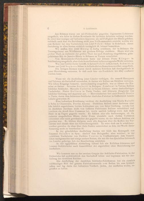 Eine befondere Erwähnung verdient die Ausftellung von Nicola Baluffi & Sohn in Chiaravalle, Provinz Ancona. Diefelben ftellten unter Anderem eine fehr hübfch zugerichtete, leichte Sohlenhaut aus, von fatter Gerbung, welche fich im Ausfehen durchaus nicht von befferen Fabricaten Italiens unterfchied und brachten ein Atteft ihrer Commune bei, worin amtlich beftätigt wird, dafs diefe Haut in 25 Tagen gegerbt wurde. Es fehlten aber alle Andeutungen, ob die anderen ausgeftellten Häute diefer Firma ebenfalls nach diefem Verfahren zubereitet oder nach gewöhnlicher Art gegerbt waren, da das äufsere Anfehen ein gleiches war. Es fehlten übrigens auch alle Angaben über die Koften des Verfahrens und ebenfo über das Gewichtsergebnifs. Es wäre diefs um fo wünſchenswerther gewefen, da ohne über diefe Punkte unterrichtet zu fein, der Werth diefer Neuerung nicht zu beurtheilen ift.