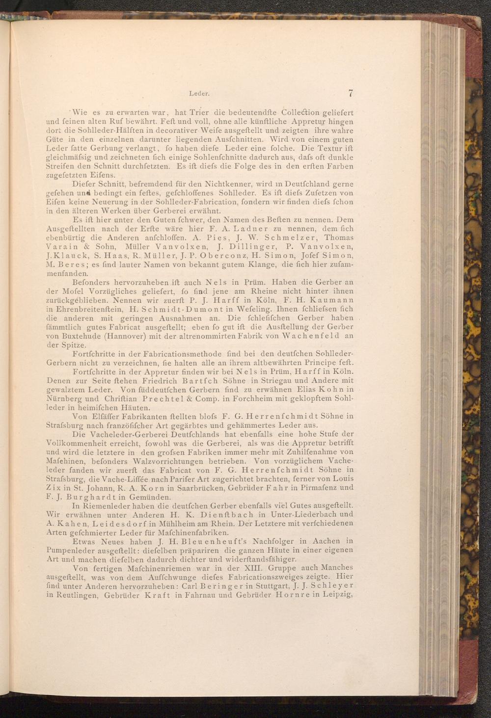 Die Vacheleder- Gerberei Deutfchlands hat ebenfalls eine hohe Stufe der Vollkommenheit erreicht, fowohl was die Gerberei, als was die Appretur betrifft und wird die letztere in den grofsen Fabriken immer mehr mit Zuhilfenahme von Mafehinen, befonders Walzvorrichtungen betrieben. Von vorzüglichem Vacheleder fanden wir zuerft das Fabricat von F. G. Herrenfchmidt Söhne in Strafsburg, die Vache- Liffée nach Parifer Art zugerichtet brachten, ferner von Louis Zix in St. Johann, R. A. Korn in Saarbrücken, Gebrüder Fahr in Pirmafenz und F. J. Burghardt in Gemünden.