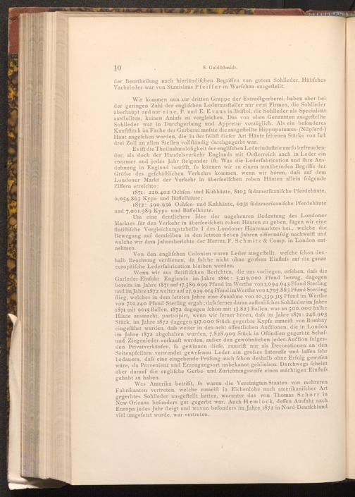 Wenn wir aus ftatiftifchen Berichten, die uns vorliegen, erfehen, dafs die Garleder- Einfuhr Englands im Jahre 1861: 5,219.000 Pfund betrug, dagegen bereits im Jahre 1871 auf 17,589.699 Pfund im Werthe von 1,094.643 Pfund Sterling und im Jahre 1872 weiter auf 27,929.014 Pfund im Werthe von 1,795.883 Pfund Sterling ftieg, welches in dem letzten Jahre eine Zunahme von 10,339.315 Pfund im Werthe von 701.240 Pfund Sterling ergab; dafs ferner daran auftralifches Sohlleder im Jahre 1871 mit 9015 Ballen, 1872 dagegen fchon mit 13.823 Ballen, was an 500.000 halbe Häute ausmacht, participirt, wenn wir ferner hören, dafs im Jahre 1871: 248.963 Stück, im Jahre 1872 dagegen 517.000 Stück gegerbte Kypfe zumeift von Bombay eingeführt wurden, dafs weiter in den acht öffentlichen Auctionen, die in London im Jahre 1872 abgehalten wurden, 7,828.909 Stück in Oftindien gegerbte Schafund Ziegenleder verkauft wurden, aufser den gewöhnlichen jeder. Auction folgenden Privatverkäufen, fo gewinnen diefe, zumeift nur als Decorationen an den Seitenpfeilern verwendet gewefenen Leder ein grofses Intereffe und laffen fehr bedauern, dafs eine eingehende Prüfung auch fchon deshalb ohne Erfolg gewefen wäre, da Provenienz und Erzeugungsort unbekannt geblieben. Durchwegs fcheint aber darauf die englifche Gerbe- und Zurichtungsweife einen mächtigen Einflufs gehabt zu haben.