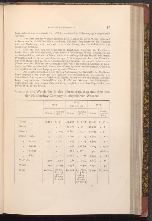 Quantum und Werth der in den Jahren 1729, 1829 und 1872 von der Hudfonsbay- Compagnie eingeführten Waaren: