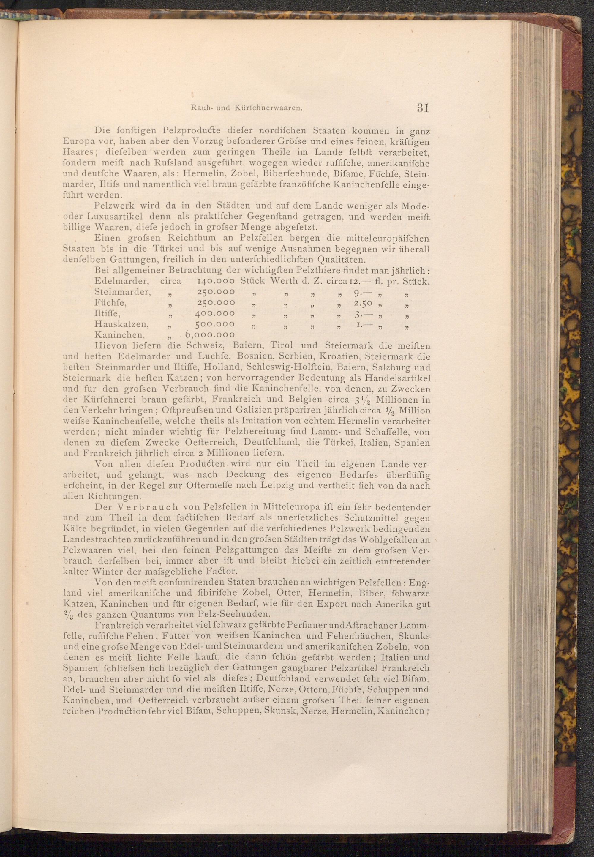 Bei allgemeiner Betrachtung der wichtigften Pelzthiere findet man jährlich: Edelmarder, circa 140.000 Stück Werth d. Z. circa 12. fl. pr. Stück.