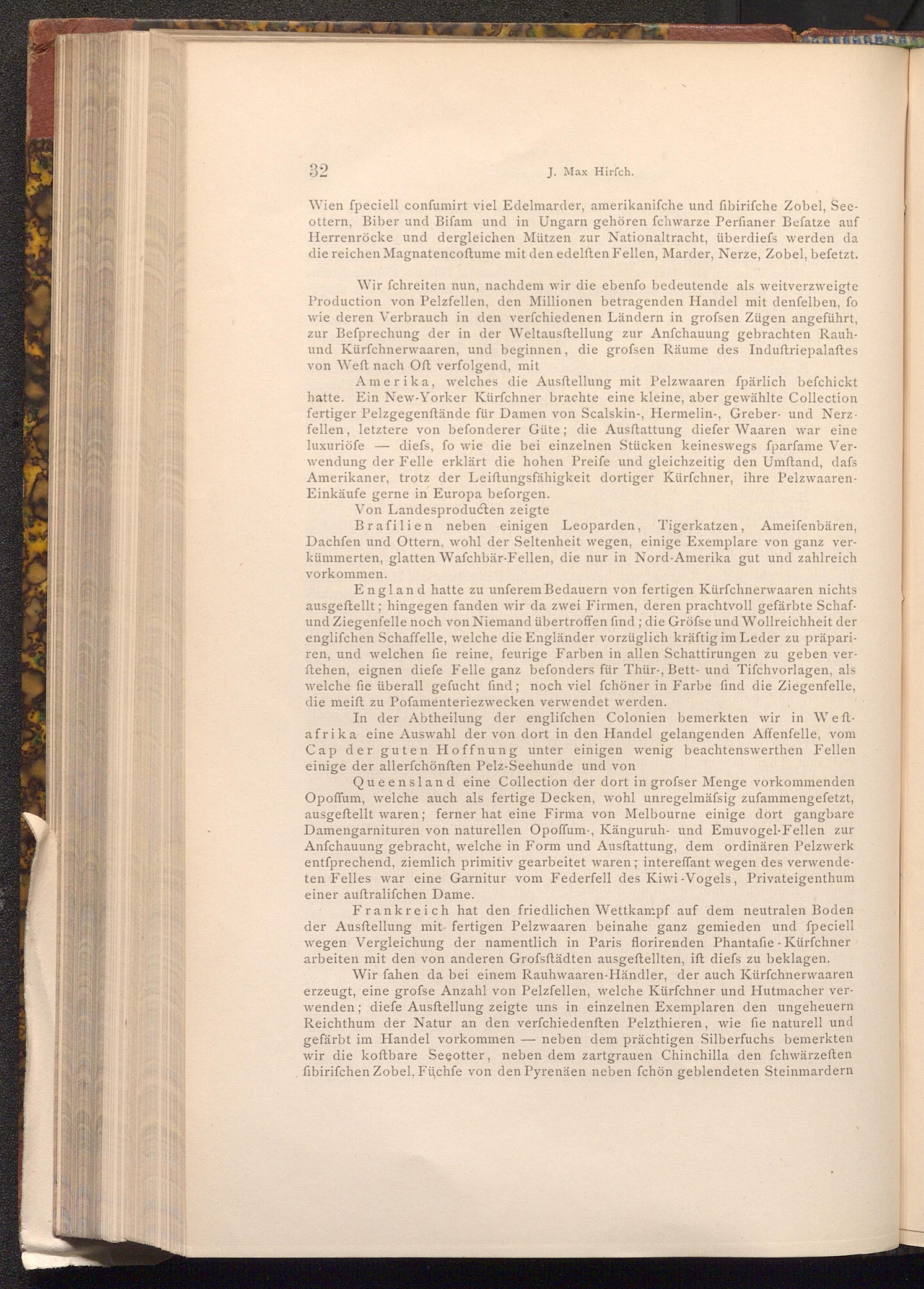 Amerika, welches die Ausftellung mit Pelzwaaren fpärlich befchickt hatte. Ein New- Yorker Kürfchner brachte eine kleine, aber gewählte Collection fertiger Pelzgegenftände für Damen von Scalskin-, Hermelin-, Greber- und Nerzfellen, letztere von befonderer Güte; die Ausstattung diefer Waaren war eine luxuriöfe diefs, fo wie die bei einzelnen Stücken keineswegs fparfame Verwendung der Felle erklärt die hohen Preife und gleichzeitig den Umftand, dafs Amerikaner, trotz der Leiftungsfähigkeit dortiger Kürfchner, ihre PelzwaarenEinkäufe gerne in Europa beforgen.