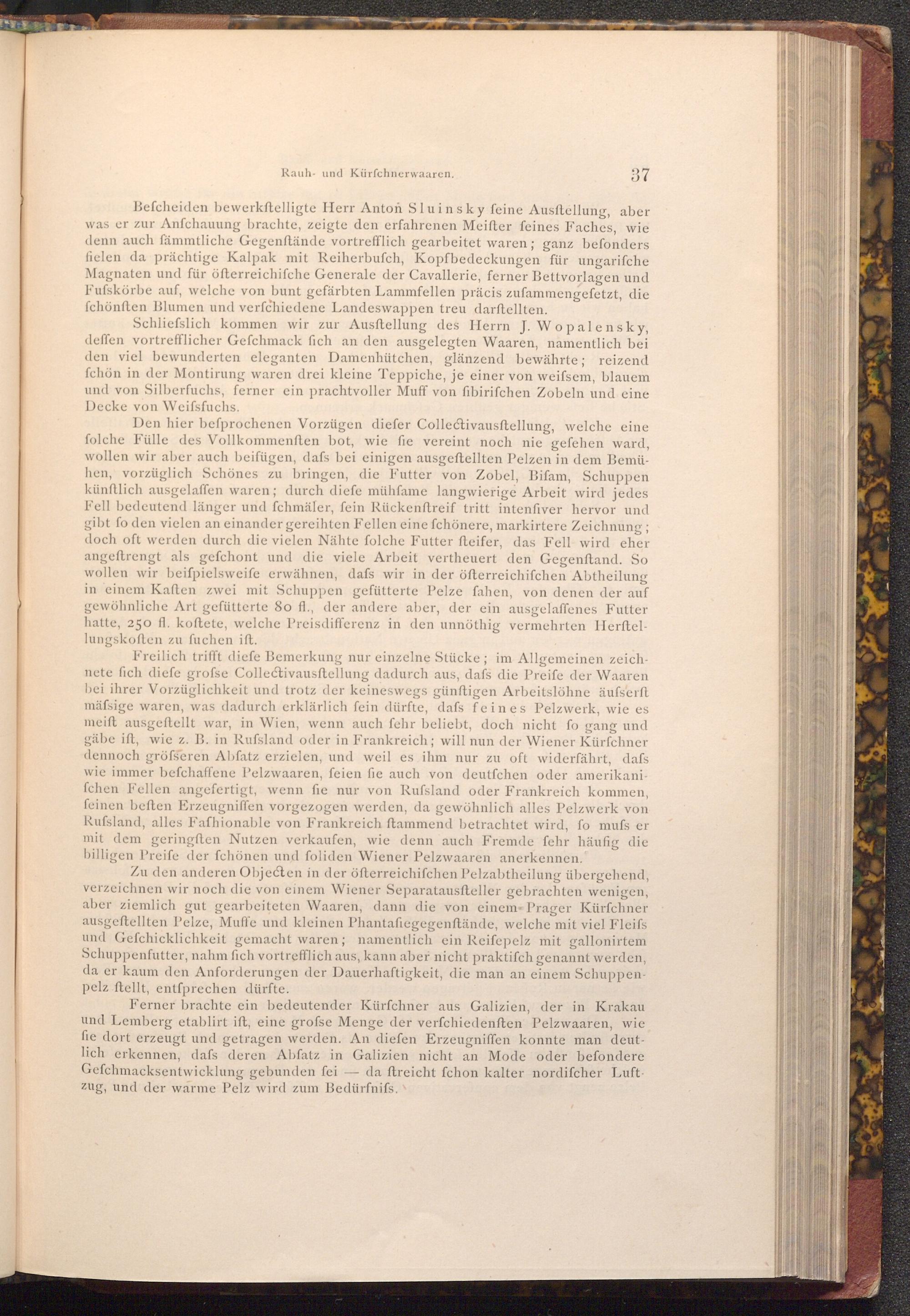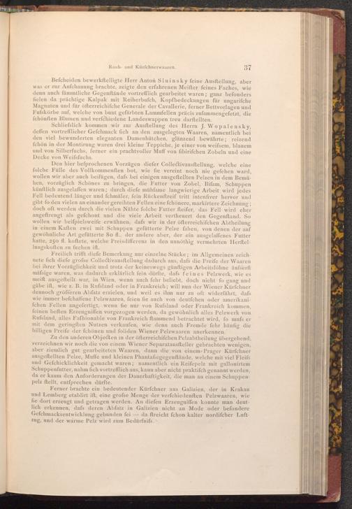 Befcheiden bewerkstelligte Herr Anton Sluinsky feine Ausstellung, aber was er zur Anfchauung brachte, zeigte den erfahrenen Meifter feines Faches, wie denn auch fämmtliche Gegenstände vortrefflich gearbeitet waren; ganz befonders fielen da prächtige Kalpak mit Reiherbufch, Kopfbedeckungen für ungarische Magnaten und für öfterreichifche Generale der Cavallerie, ferner Bettvorlagen und Fufskörbe auf, welche von bunt gefärbten Lammfellen präcis zufammengefetzt, die fchönften Blumen und verfchiedene Landeswappen treu darftellten.