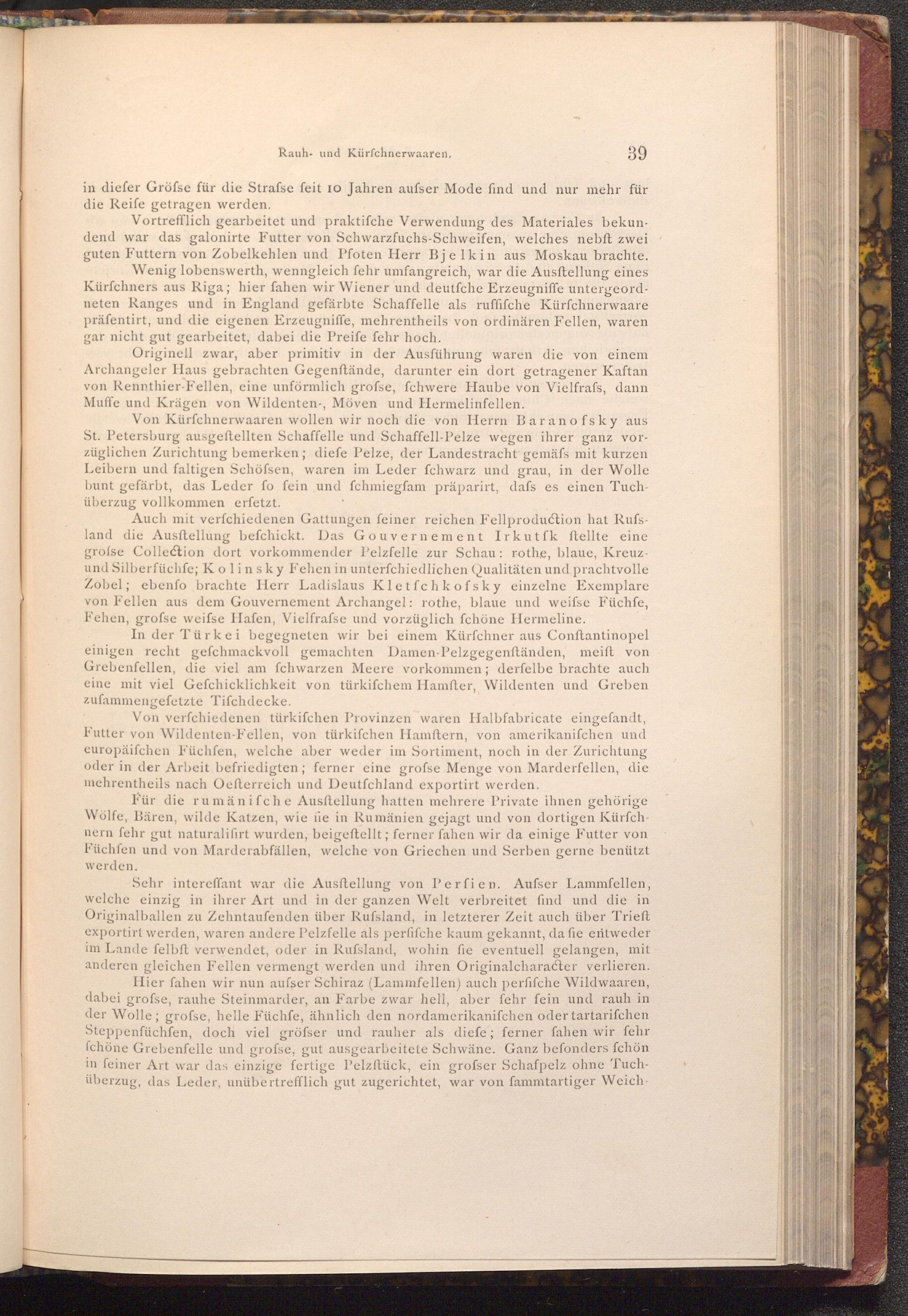 Von verfchiedenen türkifchen Provinzen waren Halbfabricate eingefandt, Futter von Wildenten- Fellen, von türkifchen Hamſtern, von amerikanifchen und europäischen Füchfen, welche aber weder im Sortiment, noch in der Zurichtung oder in der Arbeit befriedigten; ferner eine grofse Menge von Marderfellen, die mehrentheils nach Oefterreich und Deutfchland exportirt werden.