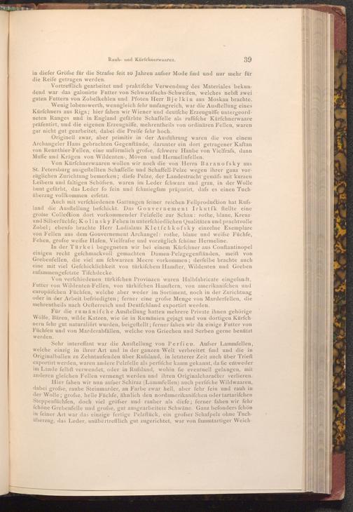 Auch mit verfchiedenen Gattungen feiner reichen Fellproduction hat Rufsland die Ausftellung befchickt. Das Gouvernement Irkutsk ftellte eine grofse Collection dort vorkommender Pelzfelle zur Schau: rothe, blaue, Kreuzund Silberfüchfe; Kolinsky Fehen in unterfchiedlichen Qualitäten und prachtvolle Zobel; ebenfo brachte Herr Ladislaus Kletfchkofsky einzelne Exemplare von Fellen aus dem Gouvernement Archangel: rothe, blaue und weifse Füchfe, Fehen, grofse weifse Hafen, Vielfrafse und vorzüglich fchöne Hermeline.