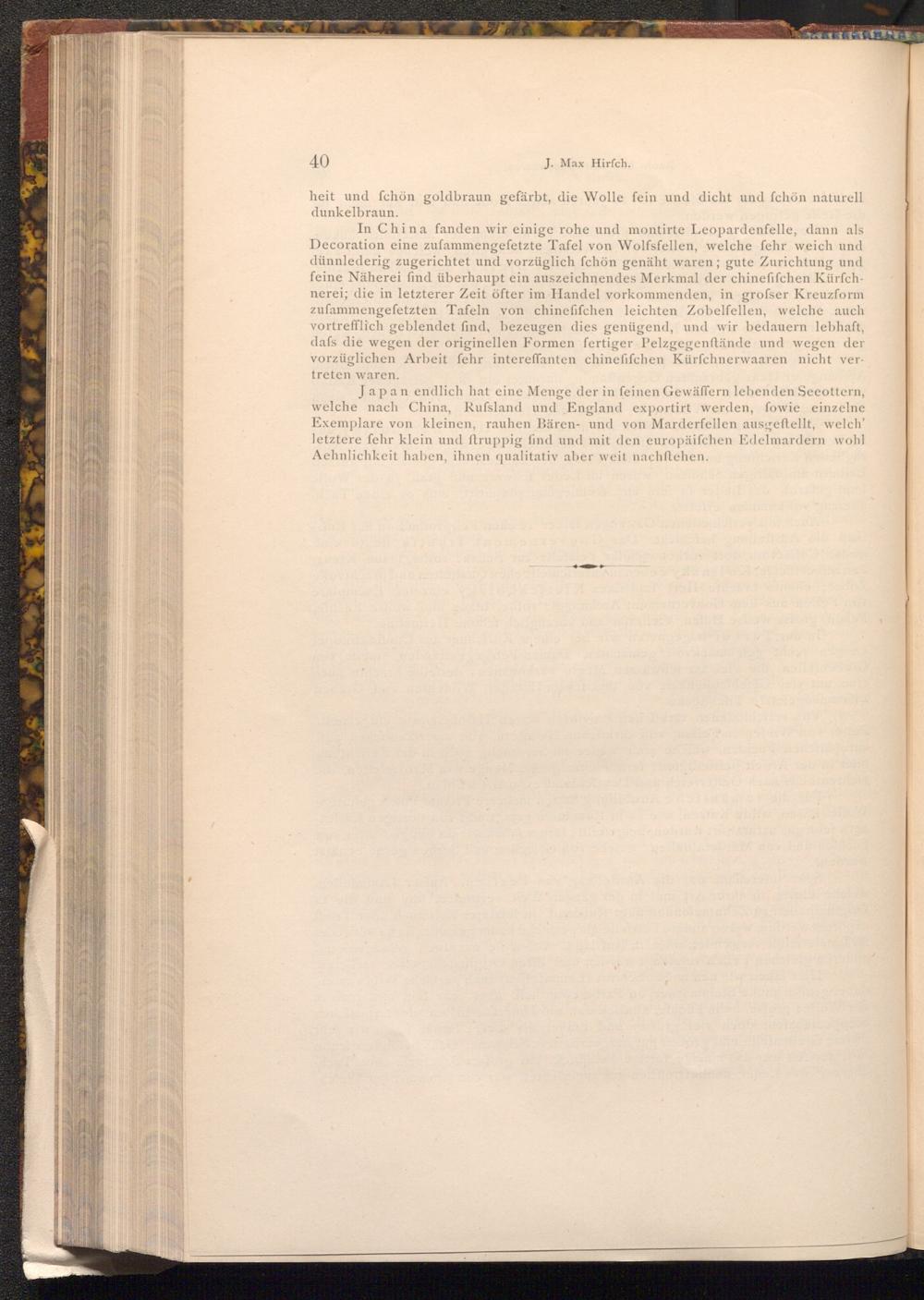 In China fanden wir einige rohe und montirte Leopardenfelle, dann als Decoration eine zufammengefetzte Tafel von Wolfsfellen, welche fehr weich und dünnlederig zugerichtet und vorzüglich fchön genäht waren; gute Zurichtung und feine Näherei find überhaupt ein auszeichnendes Merkmal der chinefifchen Kürfchnerei; die in letzterer Zeit öfter im Handel vorkommenden, in grofser Kreuzform zufammengefetzten Tafeln von chinefifchen leichten Zobelfellen, welche auch vortrefflich geblendet find, bezeugen dies genügend, und wir bedauern lebhaft, dafs die wegen der originellen Formen fertiger Pelzgegenstände und wegen der vorzüglichen Arbeit fehr intereffanten chine fifchen Kürfchnerwaaren nicht vertreten waren.