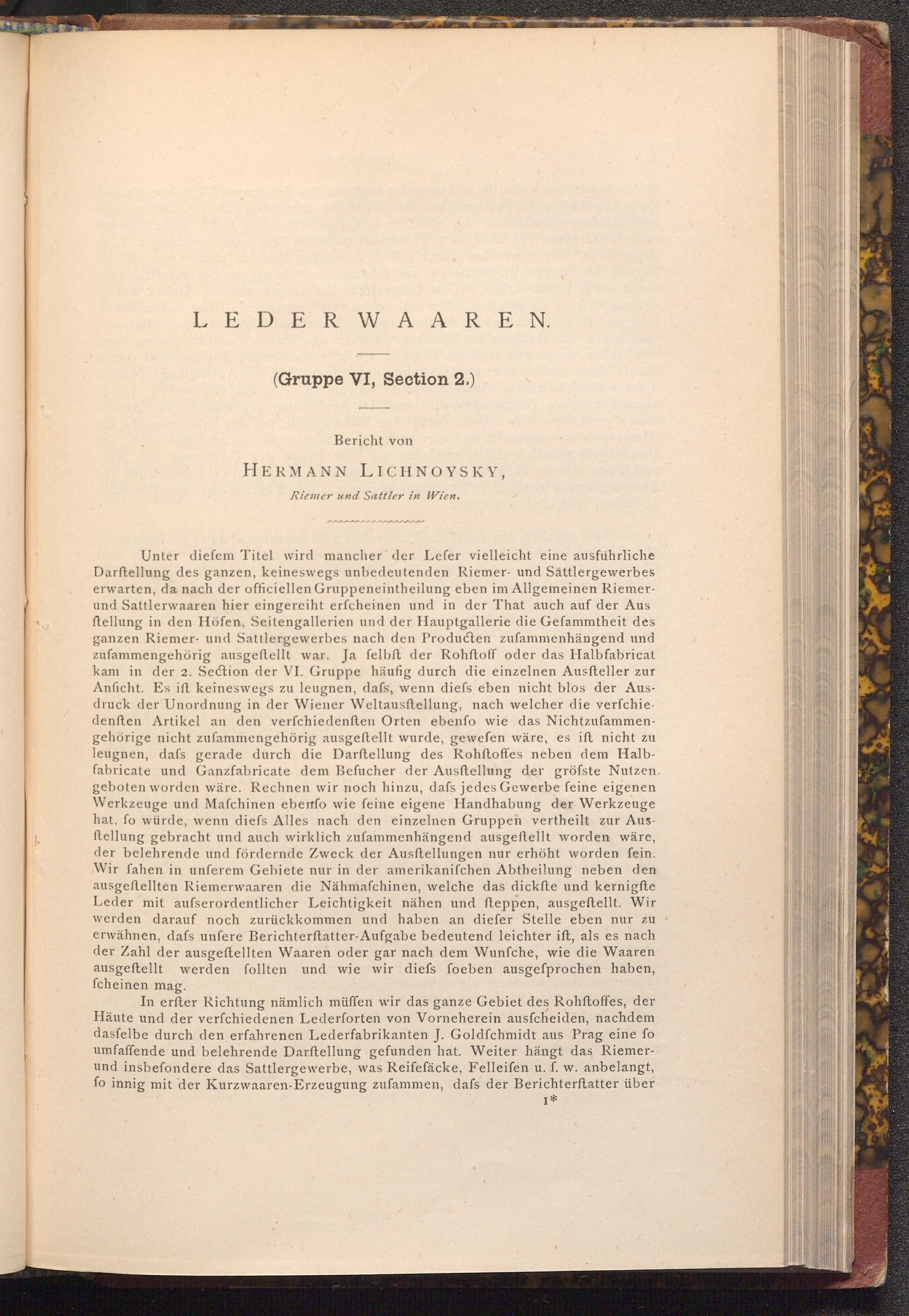 In erfter Richtung nämlich müffen wir das ganze Gebiet des Rohftoffes, der Häute und der verfchiedenen Lederforten von Vorneherein ausfcheiden, nachdem dasfelbe durch den erfahrenen Lederfabrikanten J. Goldfchmidt aus Prag eine fo umfaffende und belehrende Darftellung gefunden hat. Weiter hängt das Riemerund insbefondere das Sattlergewerbe, was Reifefäcke, Felleifen u. f. w. anbelangt, fo innig mit der Kurzwaaren- Erzeugung zufammen, dafs der Berichterstatter über