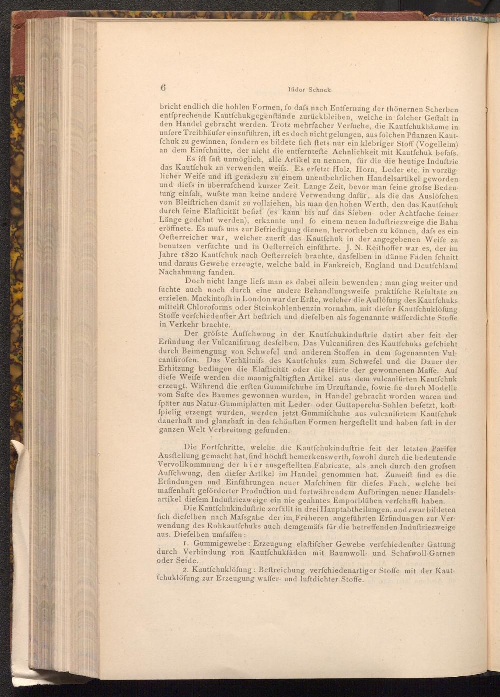 Die Fortfchritte, welche die Kautfchukinduftrie feit der letzten Parifer Ausftellung gemacht hat, find höchft bemerkenswerth, fowohl durch die bedeutende Vervollkommnung der hier ausgeftellten Fabricate, als auch durch den grofsen Auffchwung, den diefer Artikel im Handel genommen hat. Zumeift find es die Erfindungen und Einführungen neuer Mafchinen für diefes Fach, welche bei maffenhaft geförderter Production und fortwährendem Aufbringen neuer Handelsartikel diefem Induftriezweige ein nie geahntes Emporblühen verfchafft haben.