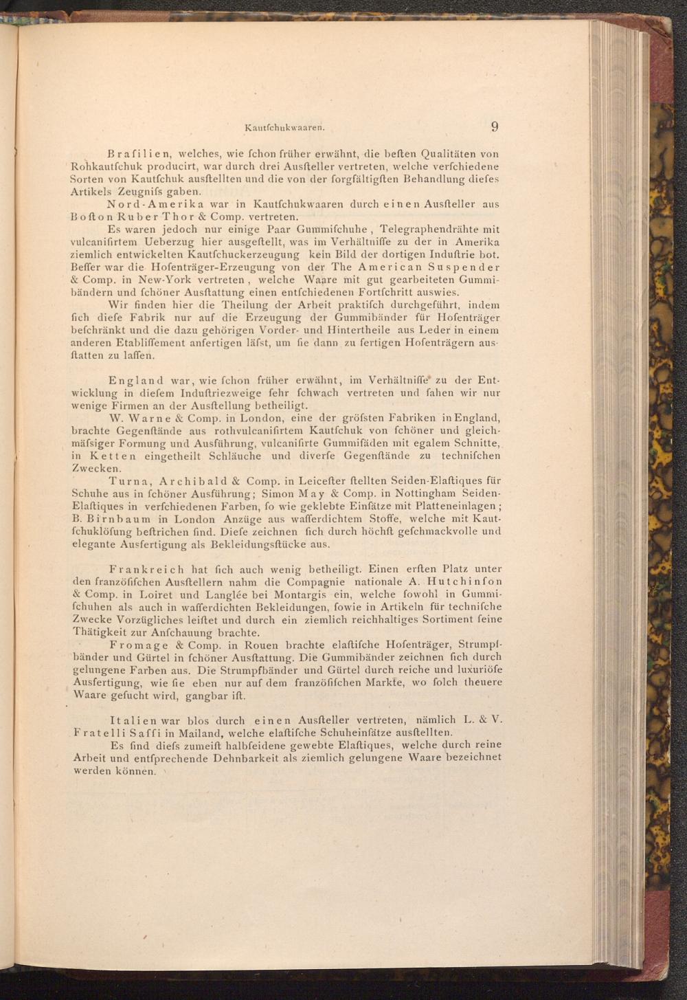 Es waren jedoch nur einige Paar Gummifchuhe, Telegraphendrähte mit vulcanifirtem Ueberzug hier ausgeftellt, was im Verhältniffe zu der in Amerika ziemlich entwickelten Kautfchuckerzeugung kein Bild der dortigen Induftrie bot. Beffer war die Hofenträger- Erzeugung von der The American Suspender & Comp. in New- York vertreten, welche Waare mit gut gearbeiteten Gummibändern und fchöner Ausftattung einen entfchiedenen Fortfchritt auswies.