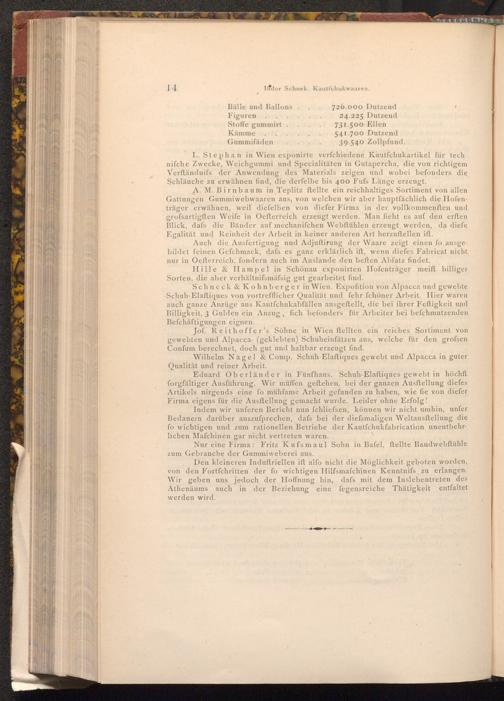 L. Stephan in Wien exponirte verfchiedene Kautfchukartikel für tech nifche Zwecke, Weichgummi und Specialitäten in Gutapercha, die von richtigem Verftändnifs der Anwendung des Materials zeigen und wobei befonders die Schläuche zu erwähnen find, die derfelbe bis 400 Fufs Länge erzeugt.