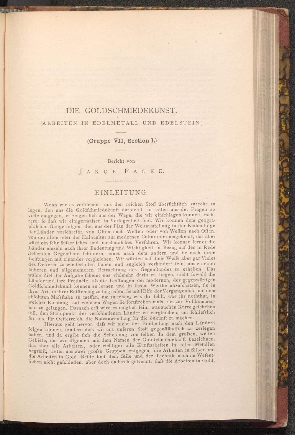 Wenn wir es verfuchen, uns den reichen Stoff überfichtlich zurecht zu legen, den uns die Goldfchmiedekunft darbietet, fo treten uns der Fragen so viele entgegen, es zeigen fich uns der Wege, die wir einfchlagen können, mehrere, fo dafs wir einigermafsen in Verlegenheit find. Wir können dem geographifchen Gange folgen, den uns der Plan der Weltausftellung in der Reihenfolge der Länder vorfchreibt, von Often nach Weften oder von Weften nach Often. von der alten oder der Halbcultur zur modernen Cultur oder umgekehrt, das aber wäre ein fehr äufserliches und mechanifches Verfahren. Wir können ferner die Länder einzeln nach ihrer Bedeutung und Wichtigkeit in Bezug auf den in Rede ftehenden Gegenftand fchildern, eines nach dem andern und fie nach ihren Leiftungen mit einander vergleichen. Wir würden auf diefe Weife aber gar Vieles des Oefteren zu wiederholen haben und zugleich verhindert fein, uns zu einer höheren und allgemeineren Betrachtung des Gegenftandes zu erheben. Das wahre Ziel der Aufgabe fcheint uns vielmehr darin zu liegen, nicht fowohl die Länder und ihre Producte, als die Leiftungen der modernen, der gegenwärtigen Goldfchmiedekunft kennen zu lernen und in ihrem Werthe abzufchätzen, fie in ihrer Art, in ihrer Entftehung zu begreifen, fie mit Hilfe der Vergangenheit mit dem abfoluten Mafsftabe zu meffen, um zu fehen, was ihr fehlt, was ihr noththut, in welcher Richtung, auf welchen Wegen fie fortftreben mufs, um zur Vollkommenheit zu gelangen. Darnach erft wird es möglich fein, was auch in Kürze gefchehen foll, den Standpunkt der verfchiedenen Länder zu vergleichen, um fchliefslich für uns, für Oefterreich, die Nutzanwendung für die Zukunft zu machen.
