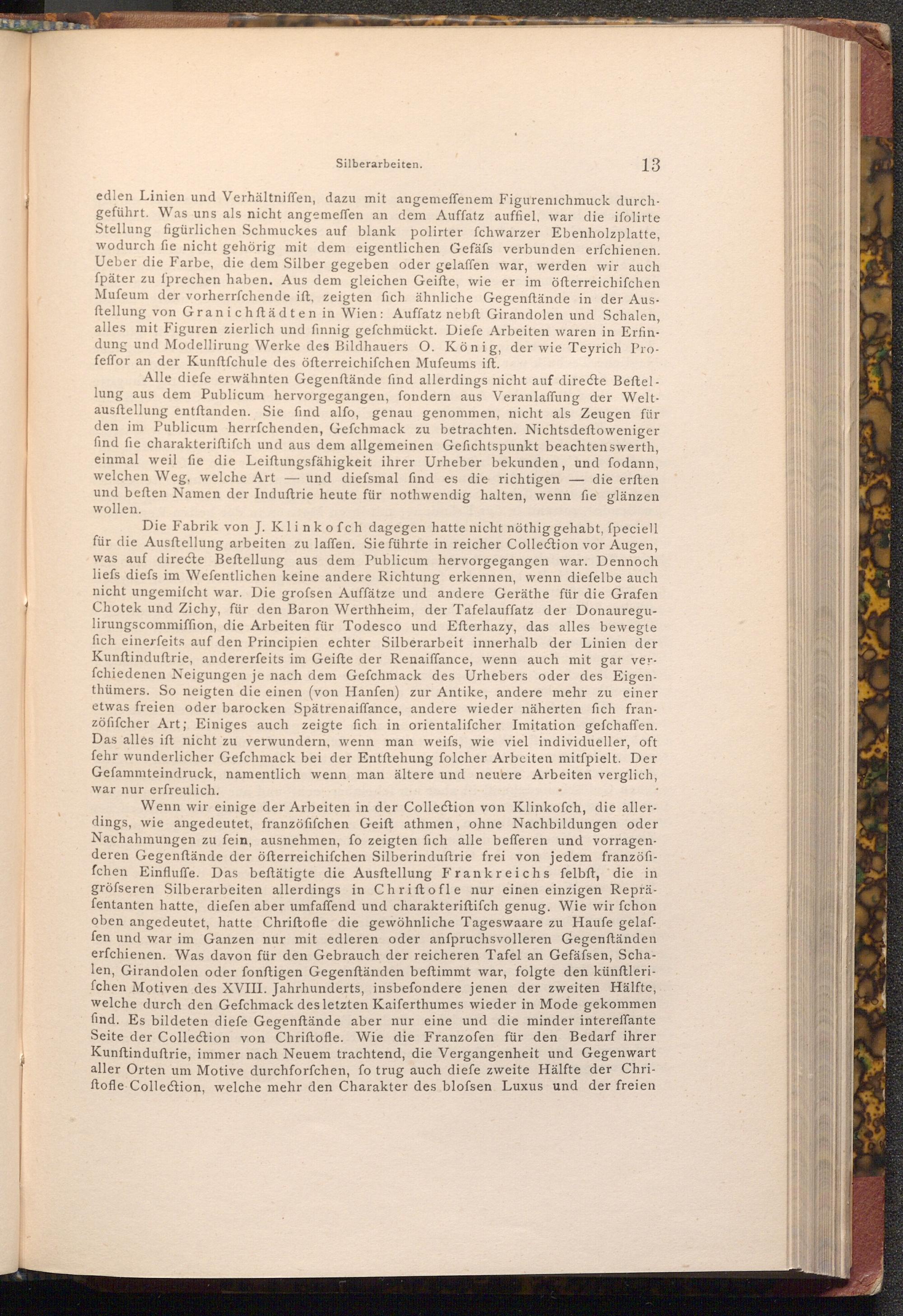 Alle diefe erwähnten Gegenftände find allerdings nicht auf directe Beftellung aus dem Publicum hervorgegangen, fondern aus Veranlaffung der Weltausftellung entftanden. Sie find alfo, genau genommen, nicht als Zeugen für den im Publicum herrfchenden, Gefchmack zu betrachten. Nichtsdeftoweniger find fie charakteriftifch und aus dem allgemeinen Gefichtspunkt beachtenswerth, einmal weil fie die Leiftungsfähigkeit ihrer Urheber bekunden, und fodann, welchen Weg, welche Art und diefsmal find es die richtigen die erften und beften Namen der Induftrie heute für nothwendig halten, wenn fie glänzen wollen.