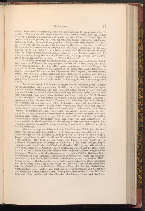 Wenn wir einige der Arbeiten in der Collection von Klinkofch, die allerdings, wie angedeutet, franzöfifchen Geift athmen, ohne Nachbildungen oder Nachahmungen zu fein, ausnehmen, fo zeigten fich alle befferen und vorragenderen Gegenftände der öfterreichifchen Silberinduftrie frei von jedem franzöfifchen Einfluffe. Das beftätigte die Ausftellung Frankreichs felbft, die in grösseren Silberarbeiten allerdings in Chriftofle nur einen einzigen Repräfentanten hatte, diefen aber umfaffend und charakteriftifch genug. Wie wir fchon oben angedeutet, hatte Chriftofle die gewöhnliche Tageswaare zu Haufe gelaffen und war im Ganzen nur mit edleren oder anfpruchsvolleren Gegenftänden erfchienen. Was davon für den Gebrauch der reicheren Tafel an Gefäfsen, Schalen, Girandolen oder fonftigen Gegenftänden beftimmt war, folgte den künftlerifchen Motiven des XVIII. Jahrhunderts, insbefondere jenen der zweiten Hälfte, welche durch den Gefchmack des letzten Kaiferthumes wieder in Mode gekommen find. Es bildeten diefe Gegenftände aber nur eine und die minder intereffante Seite der Collection von Chriftofle. Wie die Franzofen für den Bedarf ihrer Kunftinduftrie, immer nach Neuem trachtend, die Vergangenheit und Gegenwart aller Orten um Motive durchforfchen, fo trug auch diefe zweite Hälfte der Chriftofle Collection, welche mehr den Charakter des blofsen Luxus und der freien