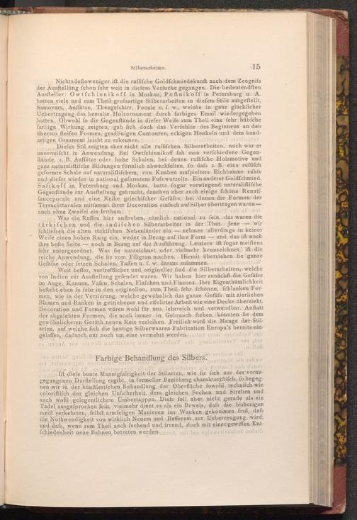 Nichtsdeftoweniger ift die ruffifche Goldfchmiedekunft nach dem Zeugnifs der Ausftellung fchon fehr weit in diefem Verfuche gegangen. Die bedeutendsten Ausfteller: Owtfchinnikoff in Moskau, Poftnikoff in Petersburgu. A. hatten viele und zum Theil grofsartige Silberarbeiten in diefem Stile ausgeftellt, Samovars, Auffätze, Theegefchirr, Pocale u. f. w., welche in ganz glücklicher Uebertragung das bemalte Holzornament durch farbiges Email wiedergegeben hatten, Obwohl fo die Gegenftände in diefer Weife zum Theil eine fehr hübfche farbige Wirkung zeigten, gab fich doch das Verfehlten des Beginnens an den überaus fteifen Formen, gradlinigen Contouren, eckigen Henkeln und dem bandartigen Ornament leicht zu erkennen. ftratu no doon bang blog