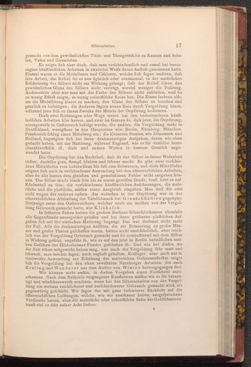 Die Oxydirung hat den Nachtheil, dafs fie das Silber in feiner Wefenheit tödtet, dasselbe grau, ftumpf, bleiern und fchwer macht. Es gibt zwar verfchiedene Mittelstufen vom lichten Grau bis faft zum Schwarzen, und diefe Mittelftufen zeigten fich auch in verfchiedener Anwendung bei den öfterreichiſchen Arbeiten, aber fie alle hatten dem gleichen und gemeinfamen Fehler nicht entgehen können. Das Silber mufs blank fein bis zu einem gewiffen Grade, fonft hört es auf. Edelmetall zu fein; die verfchiedenen künftlerifchen Anfchauungen, die malerifche und die plaftifche, müffen einen Ausgleich eingehen. Man darf die eine nicht wegen der anderen opfern. Am weiteften in der Oxydirung war in der öfterreichifchen Abtheilung der Tafelfchmuck bei Granichftädten gegangen. Derjenige unter den Oefterreichern, welcher noch am meiften von der Vergoldung Gebrauch gemacht hatte, war Klinkofch.