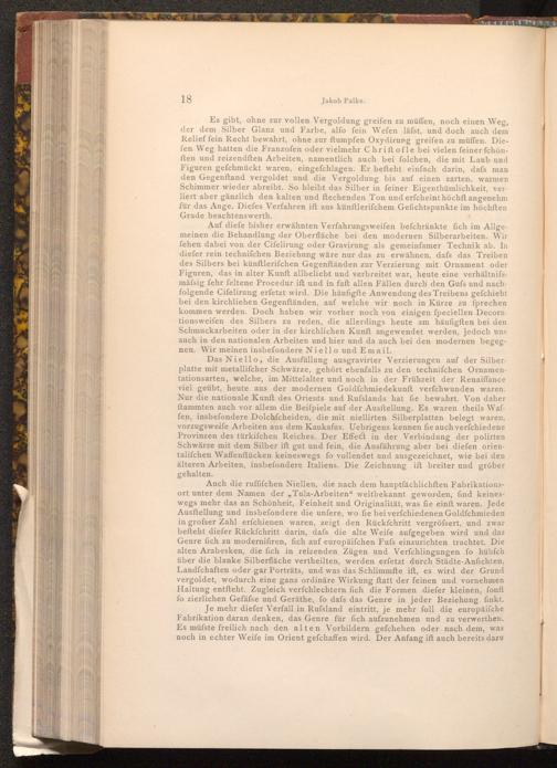 Auf diefe bisher erwähnten Verfahrungsweifen befchränkte fich im Allgemeinen die Behandlung der Oberfläche bei den modernen Silberarbeiten. Wir fehen dabei von der Cifelirung oder Gravirung als gemeinfamer Technik ab. In diefer rein technifchen Beziehung wäre nur das zu erwähnen, dafs das Treiben des Silbers bei künftlerifchen Gegenftänden zur Verzierung mit Ornament oder Figuren, das in alter Kunft allbeliebt und verbreitet war, heute eine verhältnifsmässig fehr feltene Procedur ift und in faft allen Fällen durch den Gufs und nachfolgende Cifelirung erfetzt wird. Die häufigfte Anwendung des Treibens gefchieht bei den kirchliehen Gegenftänden, auf welche wir noch in Kürze zu sprechen kommen werden. Doch haben wir vorher noch von einigen fpeciellen Decora tionsweifen des Silbers zu reden, die allerdings heute am häufigften bei den Schmuckarbeiten oder in der kirchlichen Kunft angewendet werden, jedoch uns auch in den nationalen Arbeiten und hier und da auch bei den modernen begegnen. Wir meinen insbefondere Niello und Email.