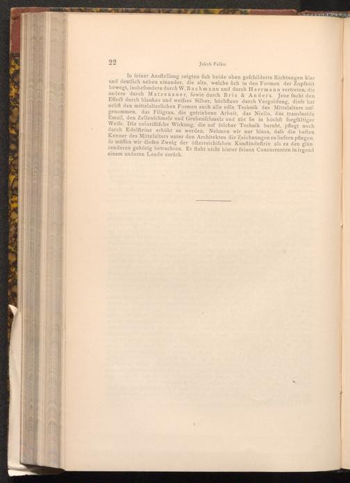 In feiner Ausftellung zeigten fich beide oben gefchilderte Richtungen klar und deutlich neben einander, die alte, welche fich in den Formen der Zopfzeit bewegt, insbefondere durch W. Bachmann und durch Herrmann vertreten, die andere durch Matzenauer, fowie durch Brix& Anders. Jene fucht den Effect durch blankes und weifses Silber, höchftens durch Vergoldung, diefe hat nebft den mittelalterlichen Formen auch alle edle Technik des Mittelalters aufgenommen, das Filigran, die getriebene Arbeit, das Niello, das translucide Email, den Zellenfchmelz und Grubenfchmelz und übt fie in höchft forgfältiger Weife. Die coloriftifche Wirkung, die auf folcher Technik beruht, pflegt noch durch Edelfteine erhöht zu werden. Nehmen wir nur hinzu, dafs die beften Kenner des Mittelalters unter den Architekten die Zeichnungen zu liefern pflegen, fo müffen wir diefen Zweig der öfterreichifchen Kunftinduftrie als zu den glän zenderen gehörig betrachten. Er fteht nicht hinter feinen Concurrenten in irgend einem anderen Lande zurück.