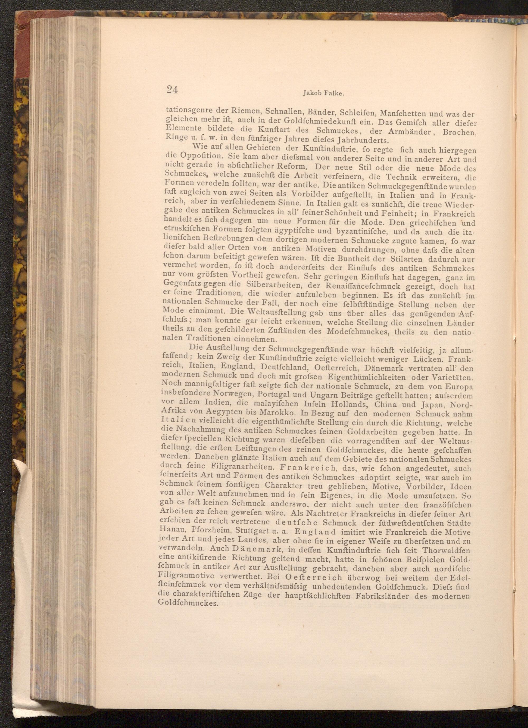 Wie auf allen Gebieten der Kunftinduftrie, fo regte fich auch hiergegen die Oppofition. Sie kam aber diefsmal von anderer Seite und in anderer Art und nicht gerade in abfichtlicher Reform. Der neue Stil oder die neue Mode des Schmuckes, welche zunächft die Arbeit verfeinern, die Technik erweitern, die Formen veredeln follten, war der antike. Die antiken Schmuckgegenstände wurden faft zugleich von zwei Seiten als Vorbilder aufgeftellt, in Italien und in Frankreich, aber in verfchiedenem Sinne. In Italien galt es zunächft, die treue Wiedergabe des antiken Schmuckes in all' feiner Schönheit und Feinheit; in Frankreich handelt es fich dagegen um neue Formen für die Mode. Den griechifchen und etruskifchen Formen folgten ägyptifche und byzantinifche, und da auch die italienifchen Beftrebungen dem dortigen modernen Schmucke zugute kamen, fo war diefer bald aller Orten von antiken Motiven durchdrungen, ohne dafs die alten fchon darum befeitigt gewefen wären. Ift die Buntheit der Stilarten dadurch nur vermehrt worden, fo ift doch andererfeits der Einfluss des antiken Schmuckes nur vom gröfsten Vortheil gewefen. Sehr geringen Einflufs hat dagegen, ganz im Gegenfatz gegen die Silberarbeiten, der Renaiffancefchmuck gezeigt, doch hat er feine Traditionen, die wieder aufzuleben beginnen. Es ift das zunächft im nationalen Schmucke der Fall, der noch eine felbftftändige Stellung neben der Mode einnimmt. Die Weltausftellung gab uns über alles das genügenden Auffchlufs; man konnte gar leicht erkennen, welche Stellung die einzelnen Länder theils zu den gefchilderten Zuftänden des Modefchmuckes, theils zu den natio. nalen Traditionen einnehmen.