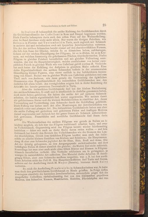 In Italien ift bekanntlich die antike Richtung des Goldfchmuckes durch die Goldfchmiedfamilie der Caftellani in Rom und Neapel begonnen worden. Diefe Familie behauptete darin auch den erften Platz auf der Weltausftellung; aber fie ftand durchaus nicht mehr allein. Nur waren die übrigen Fabriken, wie Belezza in Florenz und T werembold in Turin, noch zugleich mit Schmuck in anderer Art und insbefondere auch mit fpeciellen Juwelierarbeiten vertreten. Die Art des antiken Schmuckes beruht einmal auf den charakteriftifchen Formen, die fich dem Baue der Glieder, welche fie zu fchmücken haben, anfchmiegen, fodann auf der reichen Hinzufügung des Filigrans, fei es in Fäden, fei es in Körnern, mit welchen fammtartig die gekrümmten Flächen überdeckt werden. Diefes Filigran in gleicher Feinheit herzuftellen und mit gleicher Vollendung anzuwenden, das war die Hauptfchwierigkeit, welche zweifelsohne von keiner europäifchen Fabrik in gleicher Weife wie von Caftellani gelöft worden ift. Vielleicht hat auch keine die Erfüllung der Aufgaben in gleichem Mafse erftrebt. Eine dritte Eigenthümlichkeit des antiken Schmuckes befteht in der ornamentalen Hinzufügung kleiner Figuren, eine vierte endlich in der befcheidenen Anwendung von Email. Beides war in gleicher Weife von Caftellani gefchehen und zum Theil auch von Anderen, wie denn gerade die Verwendung des figürlichen Ornamentes eine Eigenthümlichkeit des italienifchen Goldfchmuckes war, den derfelbe faft allein befafs. Am vorzüglichften zeigten fich in diefer Beziehung die Arbeiten des bereits genannten Twerembold in Turin.