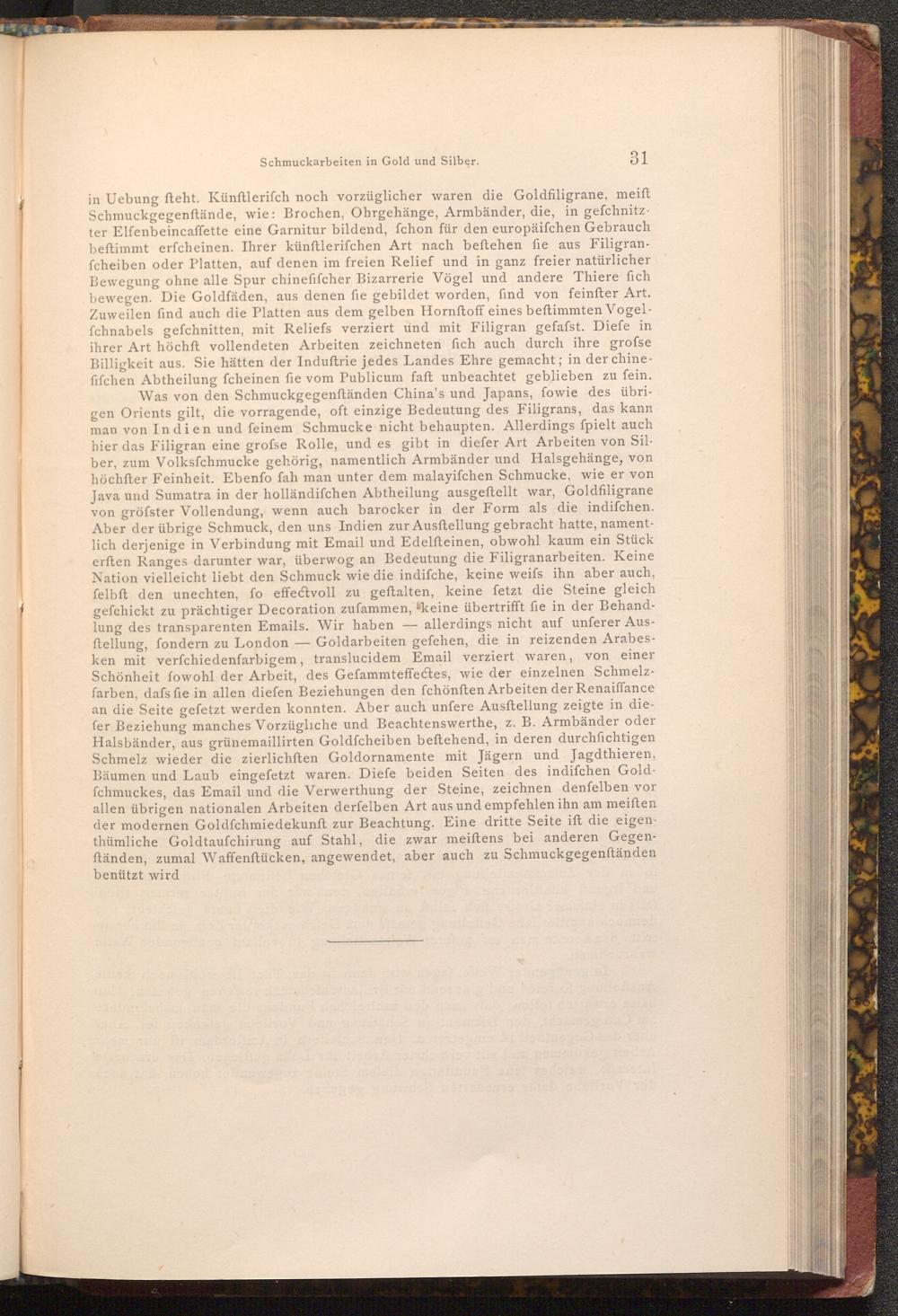 31 in Uebung fteht. Künftlerifch noch vorzüglicher waren die Goldfiligrane, meift Schmuckgegenftände, wie: Brochen, Ohrgehänge, Armbänder, die, in gefchnitz ter Elfenbeincaffette eine Garnitur bildend, fchon für den europäifchen Gebrauch beftimmt erfcheinen. Ihrer künftlerifchen Art nach beftehen fie aus Filigranfcheiben oder Platten, auf denen im freien Relief und in ganz freier natürlicher Bewegung ohne alle Spur chinefifcher Bizarrerie Vögel und andere Thiere fich bewegen. Die Goldfäden, aus denen fie gebildet worden, find von feinfter Art. Zuweilen find auch die Platten aus dem gelben Hornftoff eines beſtimmten Vogelfchnabels gefchnitten, mit Reliefs verziert und mit Filigran gefafst. Diefe in ihrer Art höchft vollendeten Arbeiten zeichneten fich auch durch ihre grofse Billigkeit aus. Sie hätten der Induſtrie jedes Landes Ehre gemacht; in der chinefifchen Abtheilung fcheinen fie vom Publicum faft unbeachtet geblieben zu fein. Was von den Schmuckgegenständen China's und Japans, fowie des übrigen Orients gilt, die vorragende, oft einzige Bedeutung des Filigrans, das kann man von Indien und feinem Schmucke nicht behaupten. Allerdings fpielt auch hier das Filigran eine grofse Rolle, und es gibt in diefer Art Arbeiten von Silber, zum Volksfchmucke gehörig, namentlich Armbänder und Halsgehänge, von höchfter Feinheit. Ebenfo fah man unter dem malayifchen Schmucke, wie er von Java und Sumatra in der holländifchen Abtheilung ausgeftellt war, Goldfiligrane von gröfster Vollendung, wenn auch barocker in der Form als die indifchen. Aber der übrige Schmuck, den uns Indien zur Ausftellung gebracht hatte, namentlich derjenige in Verbindung mit Email und Edelſteinen, obwohl kaum ein Stück erften Ranges darunter war, überwog an Bedeutung die Filigranarbeiten. Keine Nation vielleicht liebt den Schmuck wie die indifche, keine weifs ihn aber auch, felbft den unechten, fo effectvoll zu geftalten, keine fetzt die Steine gleich gefchickt zu prächtiger Decoration zufammen, keine übertrifft fie in der Behandlung des transparenten Emails. Wir haben allerdings nicht auf unferer Ausftellung, fondern zu London- Goldarbeiten gefehen, die in reizenden Arabesken mit verfchiedenfarbigem, translucidem Email verziert waren, von einer Schönheit fowohl der Arbeit, des Gefammteffectes, wie der einzelnen Schmelzfarben, dafs fie in allen diefen Beziehungen den fchönften Arbeiten der Renaiffance an die Seite gefetzt werden konnten. Aber auch unfere Ausstellung zeigte in diefer Beziehung manches Vorzügliche und Beachtenswerthe, z. B. Armbänder oder Halsbänder, aus grünemaillirten Goldfcheiben beftehend, in deren durchfichtigen Schmelz wieder die zierlichften Goldornamente mit Jägern und Jagdthieren, Bäumen und Laub eingefetzt waren. Diefe beiden Seiten des indifchen Goldfchmuckes, das Email und die Verwerthung der Steine, zeichnen denfelben vor allen übrigen nationalen Arbeiten derfelben Art aus und empfehlen ihn am meiſten der modernen Goldfchmiedekunft zur Beachtung. Eine dritte Seite ift die eigenthümliche Goldtaufchirung auf Stahl, die zwar meiftens bei anderen Gegenftänden, zumal Waffenftücken, angewendet, aber auch zu Schmuckgegenftänden benützt wird
