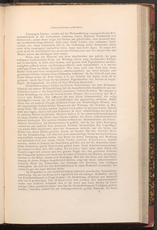 Im Gegensatz zu den verhältnifsmäfsig zahlreich anwefenden franzöfifchen Juwelieren, war es von England eigentlich nur ein einziger Ausfteller, der für den Edelfteinfchmuck in Frage kommt; die Ausftellung desfelben war materiell aber um fo grofsartiger. Das ift Hancock von London. Der aufserordentlich reiche und koftbare Schmuck, den er für Lord und Lady Dudley im Laufe weniger Jahre gearbeitet hatte, war ihm für die Ausftellung zur Verfügung gestellt worden; darunter befand fich ein aufsergewöhnlich grofser Diamant, der Stern