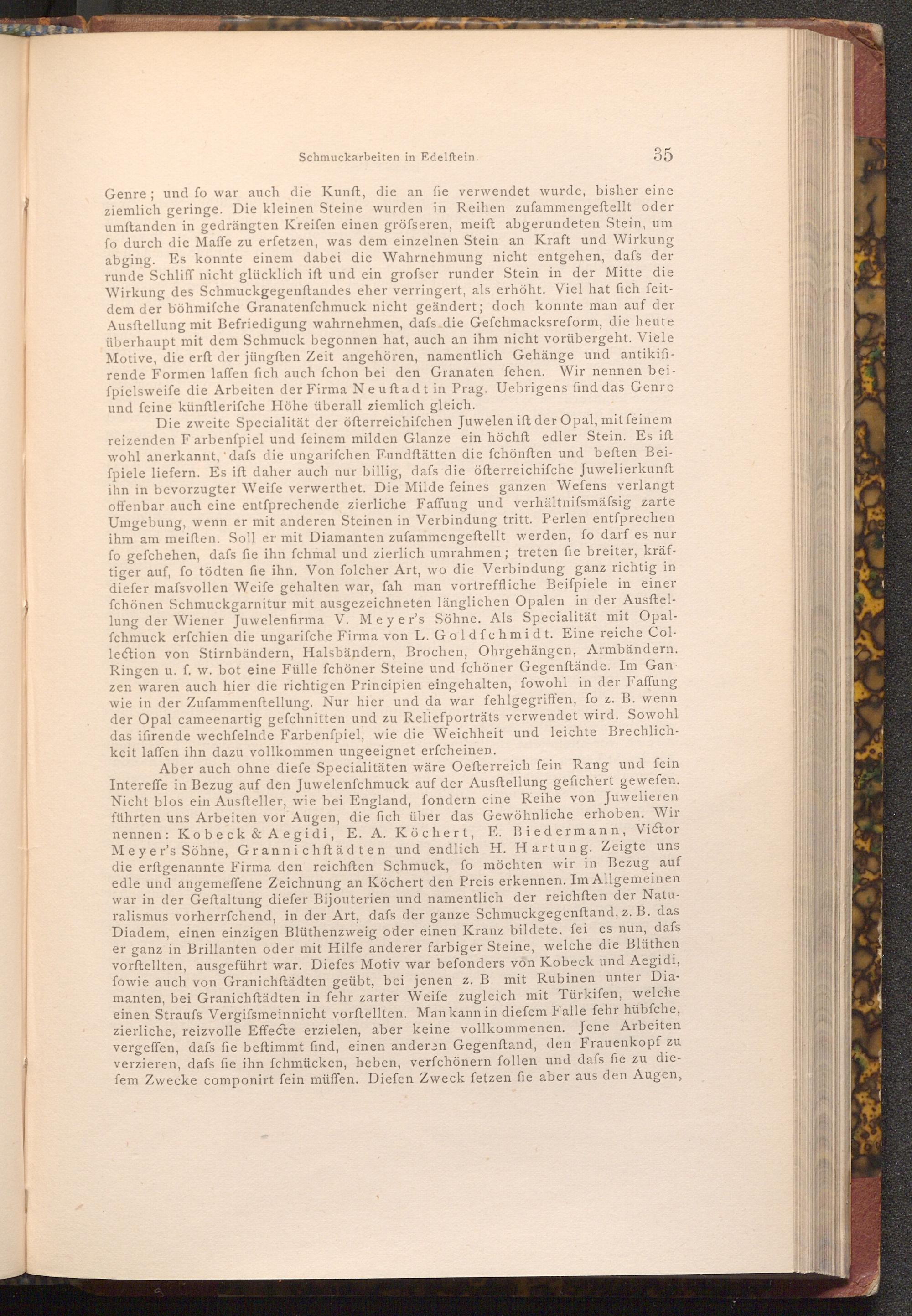 Aber auch ohne diefe Specialitäten wäre Oefterreich fein Rang und fein Intereffe in Bezug auf den Juwelenfchmuck auf der Ausftellung gefichert gewefen. Nicht blos ein Ausfteller, wie bei England, fondern eine Reihe von Juwelieren führten uns Arbeiten vor Augen, die fich über das Gewöhnliche erhoben. Wir nennen: Kobeck& Aegidi, E. A. Köchert, E. Biedermann, Victor Meyer's Söhne, Grannichftädten und endlich H. Hartung. Zeigte uns die erftgenannte Firma den reichften Schmuck, fo möchten wir in Bezug auf edle und angemeffene Zeichnung an Köchert den Preis erkennen. Im Allgemeinen war in der Geftaltung diefer Bijouterien und namentlich der reichften der Naturalismus vorherrfchend, in der Art, dafs der ganze Schmuckgegenftand, z. B. das Diadem, einen einzigen Blüthenzweig oder einen Kranz bildete, fei es nun, daſs er ganz in Brillanten oder mit Hilfe anderer farbiger Steine, welche die Blüthen vorftellten, ausgeführt war. Diefes Motiv war befonders von Kobeck und Aegidi, fowie auch von Granichftädten geübt, bei jenen z. B. mit Rubinen unter Diamanten, bei Granichftädten in fehr zarter Weife zugleich mit Türkifen, welche einen Straufs Vergifsmeinnicht vorftellten. Man kann in diefem Falle fehr hübfche, zierliche, reizvolle Effecte erzielen, aber keine vollkommenen. Jene Arbeiten. vergeffen, dafs fie beftimmt find, einen anderen Gegenftand, den Frauenkopf zu verzieren, dafs fie ihn fchmücken, heben, verfchönern follen und dafs fie zu diefem Zwecke componirt fein müffen. Diefen Zweck fetzen fie aber aus den Augen,