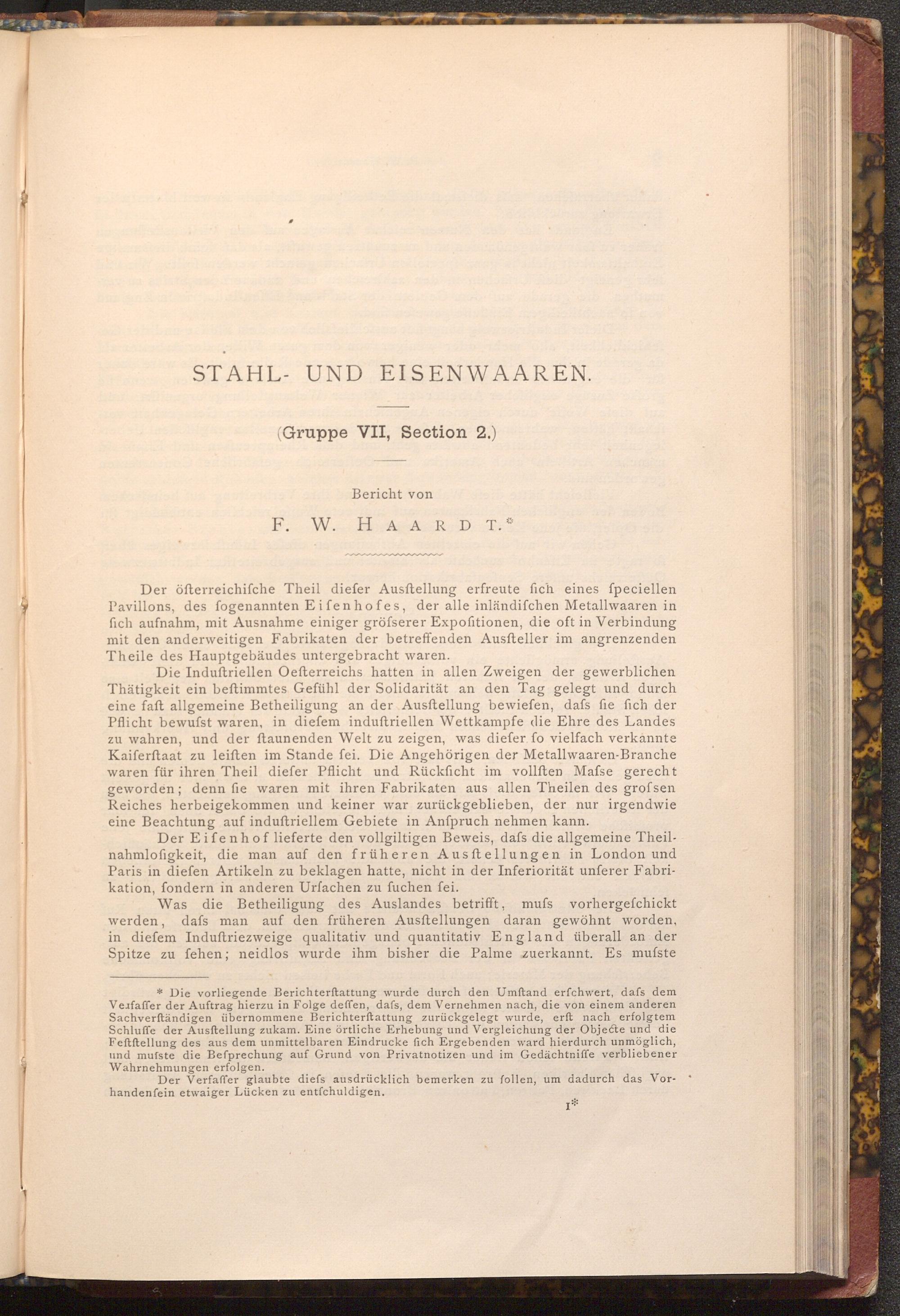 Die Induftriellen Oefterreichs hatten in allen Zweigen der gewerblichen Thätigkeit ein beftimmtes Gefühl der Solidarität an den Tag gelegt und durch eine faft allgemeine Betheiligung an der Ausftellung bewiefen, dafs fie fich der Pflicht bewusst waren, in diefem induftriellen Wettkampfe die Ehre des Landes zu wahren, und der ftaunenden Welt zu zeigen, was diefer fo vielfach verkannte Kaiferftaat zu leiften im Stande fei. Die Angehörigen der Metallwaaren- Branche waren für ihren Theil diefer Pflicht und Rückficht im vollften Mafse gerecht geworden; denn fie waren mit ihren Fabrikaten aus allen Theilen des grofsen Reiches herbeigekommen und keiner war zurückgeblieben, der nur irgendwie eine Beachtung auf induftriellem Gebiete in Anspruch nehmen kann.