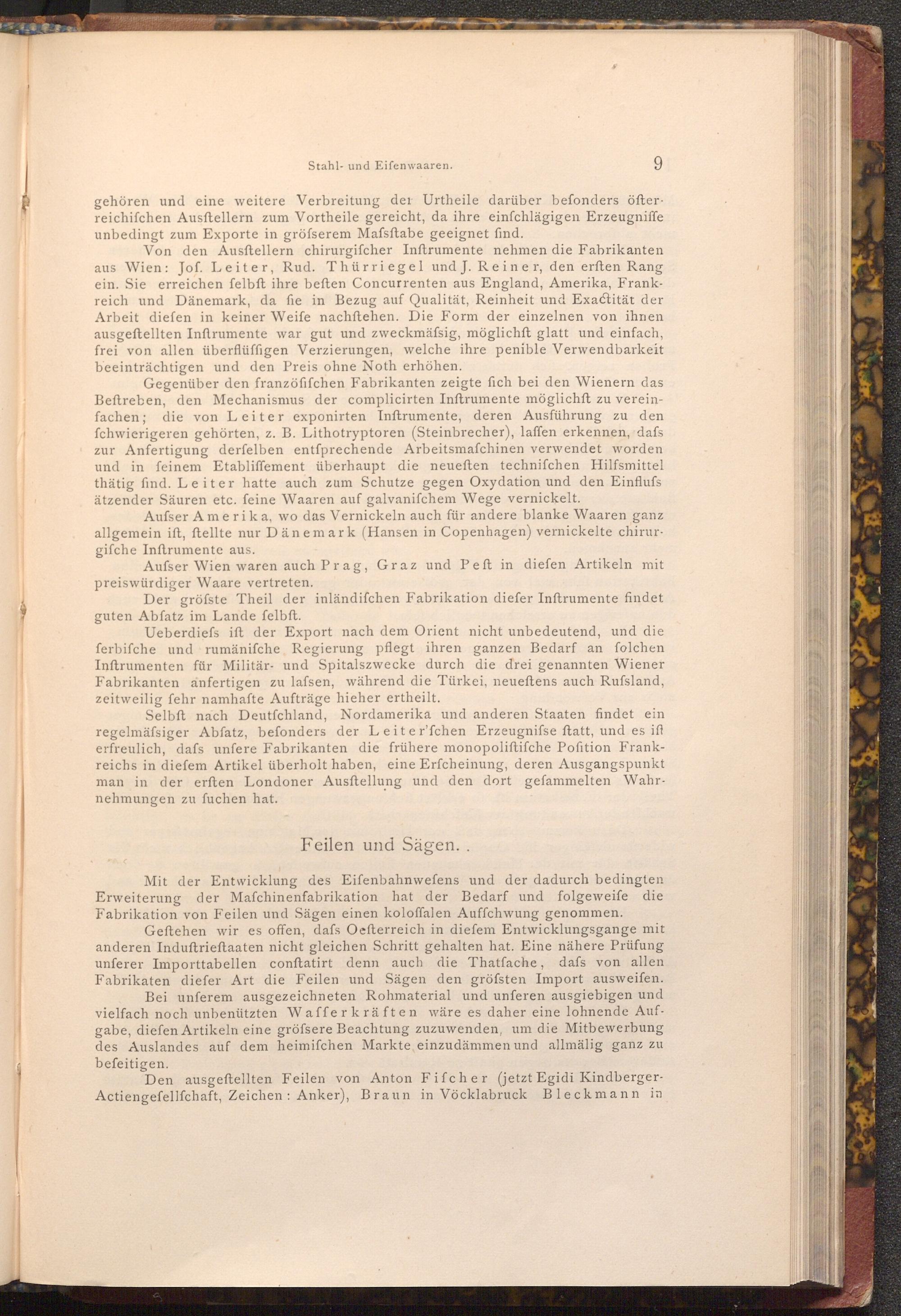 Von den Ausftellern chirurgifcher Inftrumente nehmen die Fabrikanten aus Wien: Jof. Leiter, Rud. Thürriegel und J. Reiner, den erften Rang ein. Sie erreichen felbft ihre beften Concurrenten aus England, Amerika, Frankreich und Dänemark, da fie in Bezug auf Qualität, Reinheit und Exactität der Arbeit diefen in keiner Weife nachftehen. Die Form der einzelnen von ihnen ausgeftellten Inftrumente war gut und zweckmäfsig, möglichft glatt und einfach, frei von allen überflüffigen Verzierungen, welche ihre penible Verwendbarkeit beeinträchtigen und den Preis ohne Noth erhöhen.