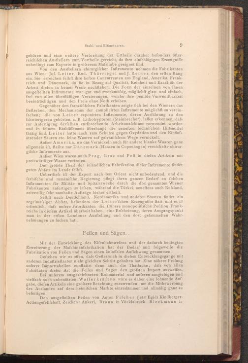 Ueberdiefs ift der Export nach dem Orient nicht unbedeutend, und die ferbifche und rumänifche Regierung pflegt ihren ganzen Bedarf an folchen Inftrumenten für Militär- und Spitalszwecke durch die drei genannten Wiener Fabrikanten anfertigen zu lafsen, während die Türkei, neueftens auch Rufsland, zeitweilig fehr namhafte Aufträge hieher ertheilt.
