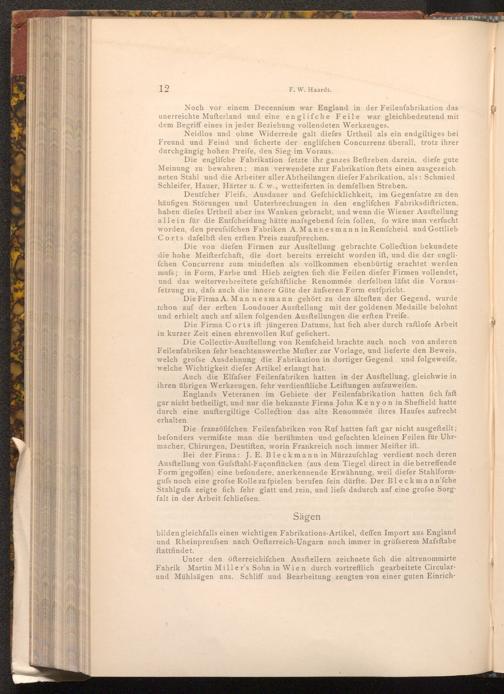 Deutfcher Fleifs, Ausdauer und Gefchicklichkeit, im Gegenfatze zu den häufigen Störungen und Unterbrechungen in den englifchen Fabriks diftricten, haben diefes Urtheil aber ins Wanken gebracht, und wenn die Wiener Ausftellung allein für die Entfcheidung hätte mafsgebend fein follen, fo wäre man verfucht worden, den preufsifchen Fabriken A. Mannesmann in Remfcheid und Gottlieb Corts dafelbft den erften Preis zuzufprechen.