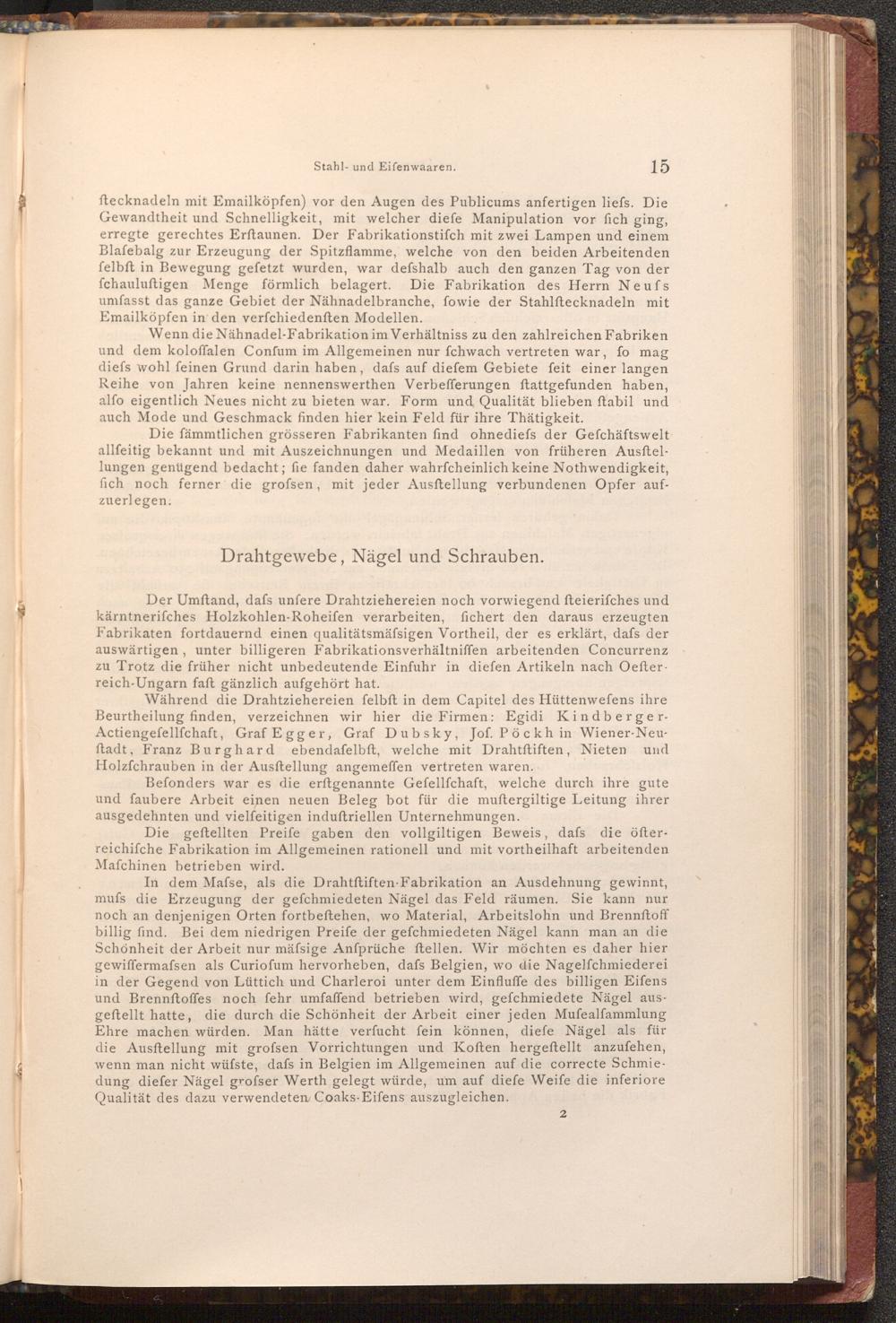 Während die Drahtziehereien felbft in dem Capitel des Hüttenwefens ihre Beurtheilung finden, verzeichnen wir hier die Firmen: Egidi KindbergerActiengeſellſchaft, Graf Egger, Graf Dubsky, Jof. Pöckh in Wiener- Neuftadt, Franz Burghard ebendafelbft, welche mit Drahtftiften, Nieten und Holzfchrauben in der Ausftellung angemeffen vertreten waren.