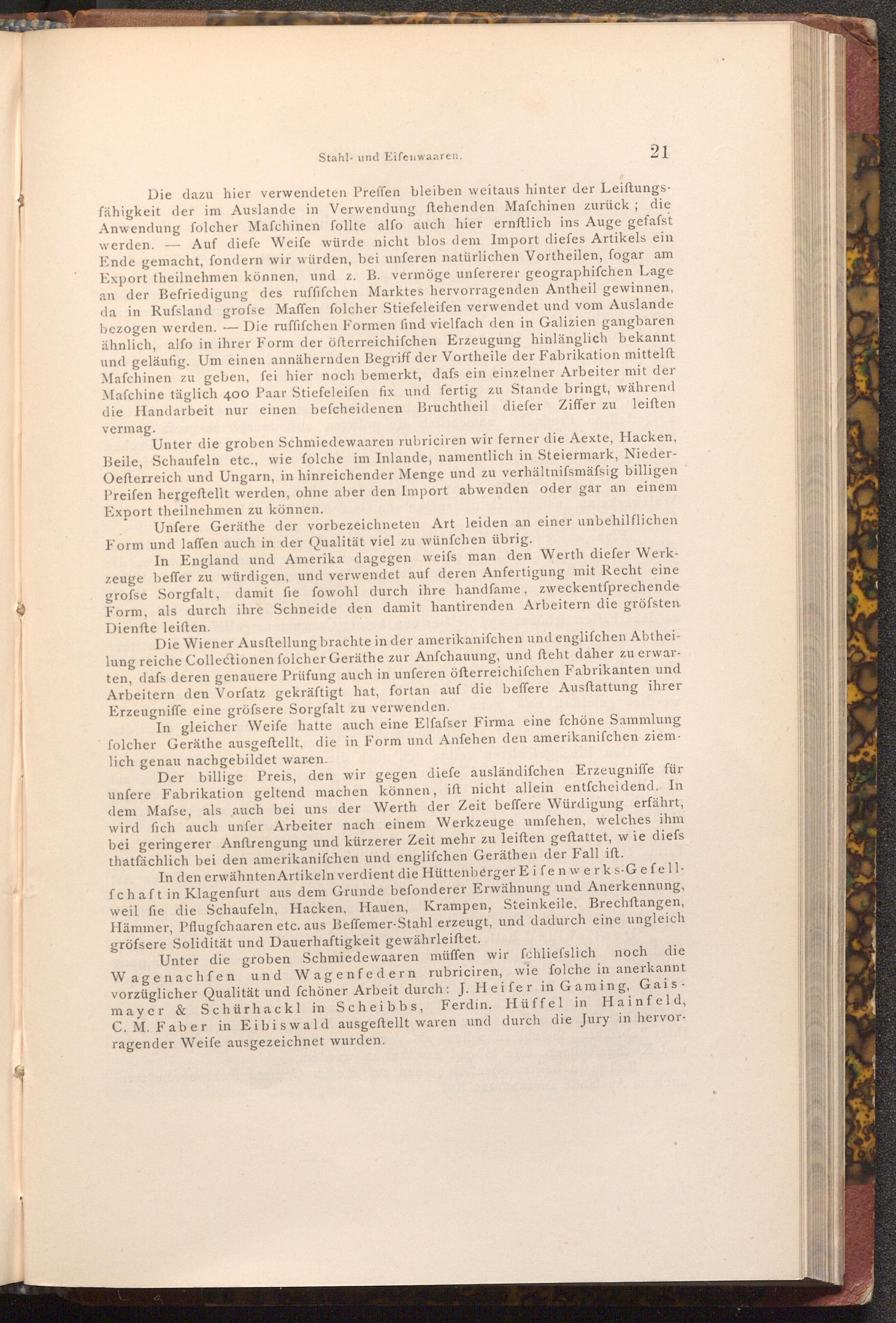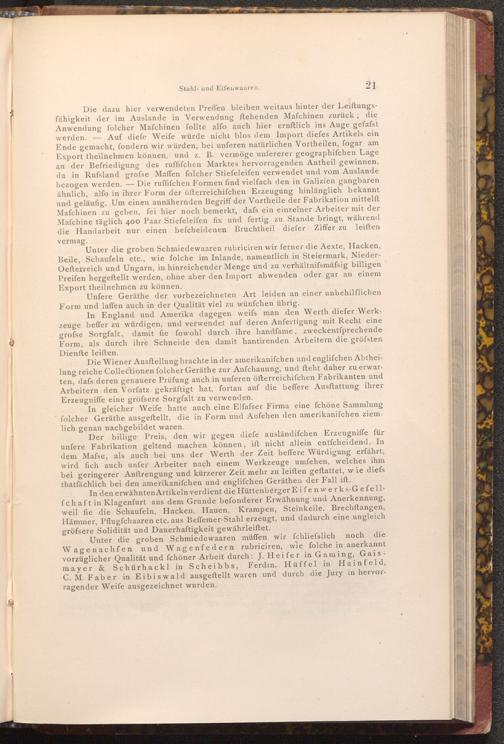 Unter die groben Schmiedewaaren müffen wir fchliefslich Wagenachfen und Wagenfedern rubriciren, wie folche in anerkannt vorzüglicher Qualität und fchöner Arbeit durch: J. Heifer in Gaming, Gaismayer& Schürhackl in Scheibbs, Ferdin. Hüffel in Hainfeld, C. M. Faber in Eibiswald ausgeftellt waren und durch die Jury in hervorragender Weife ausgezeichnet wurden.