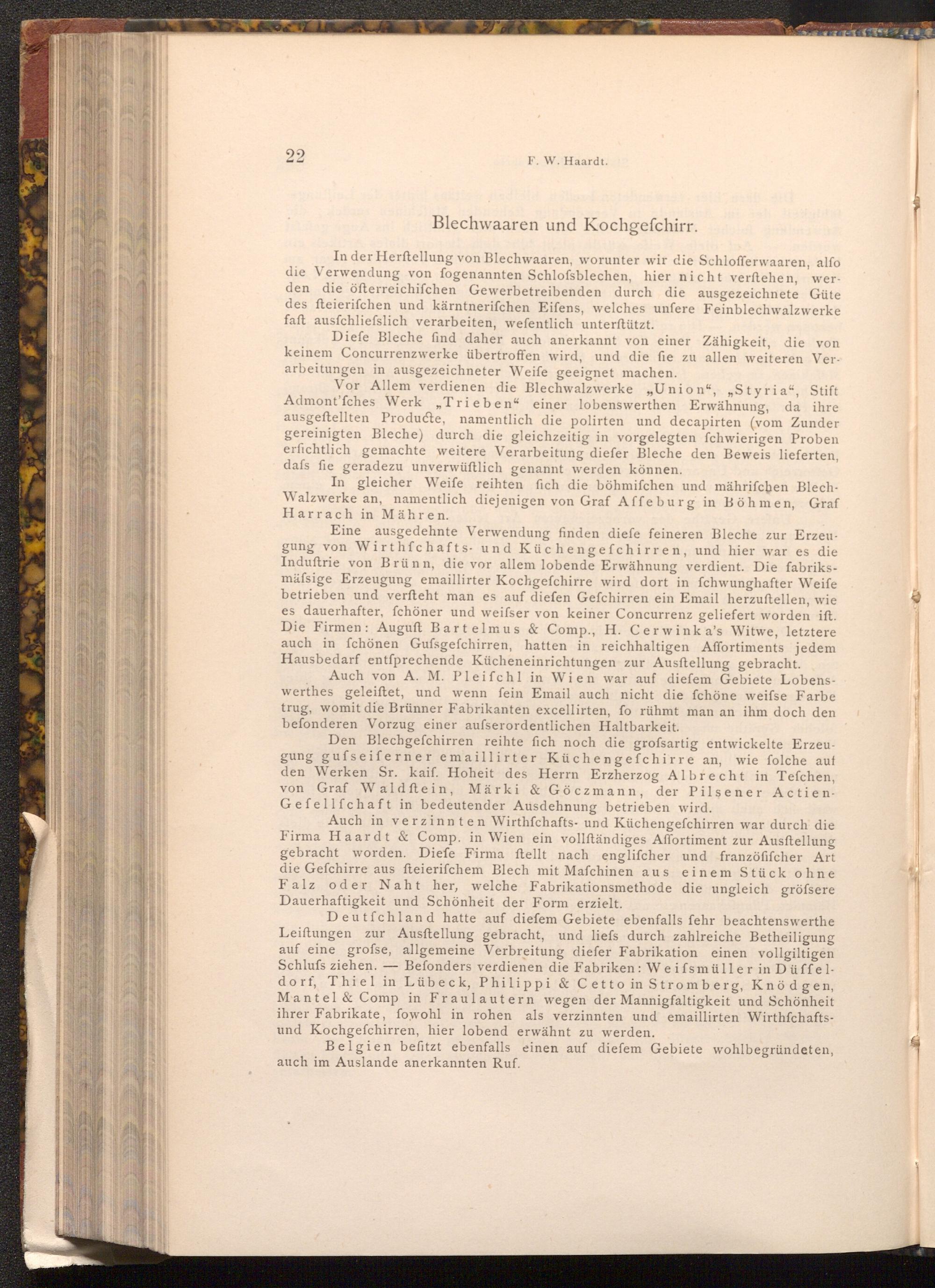 In der Herſtellung von Blechwaaren, worunter wir die Schlofferwaaren, alfo die Verwendung von fogenannten Schlofsblechen, hier nicht verftehen, werden die öfterreichifchen Gewerbetreibenden durch die ausgezeichnete Güte des fteierifchen und kärntnerifchen Eifens, welches unfere Feinblechwalzwerke faft ausfchliefslich verarbeiten, wefentlich unterſtützt.