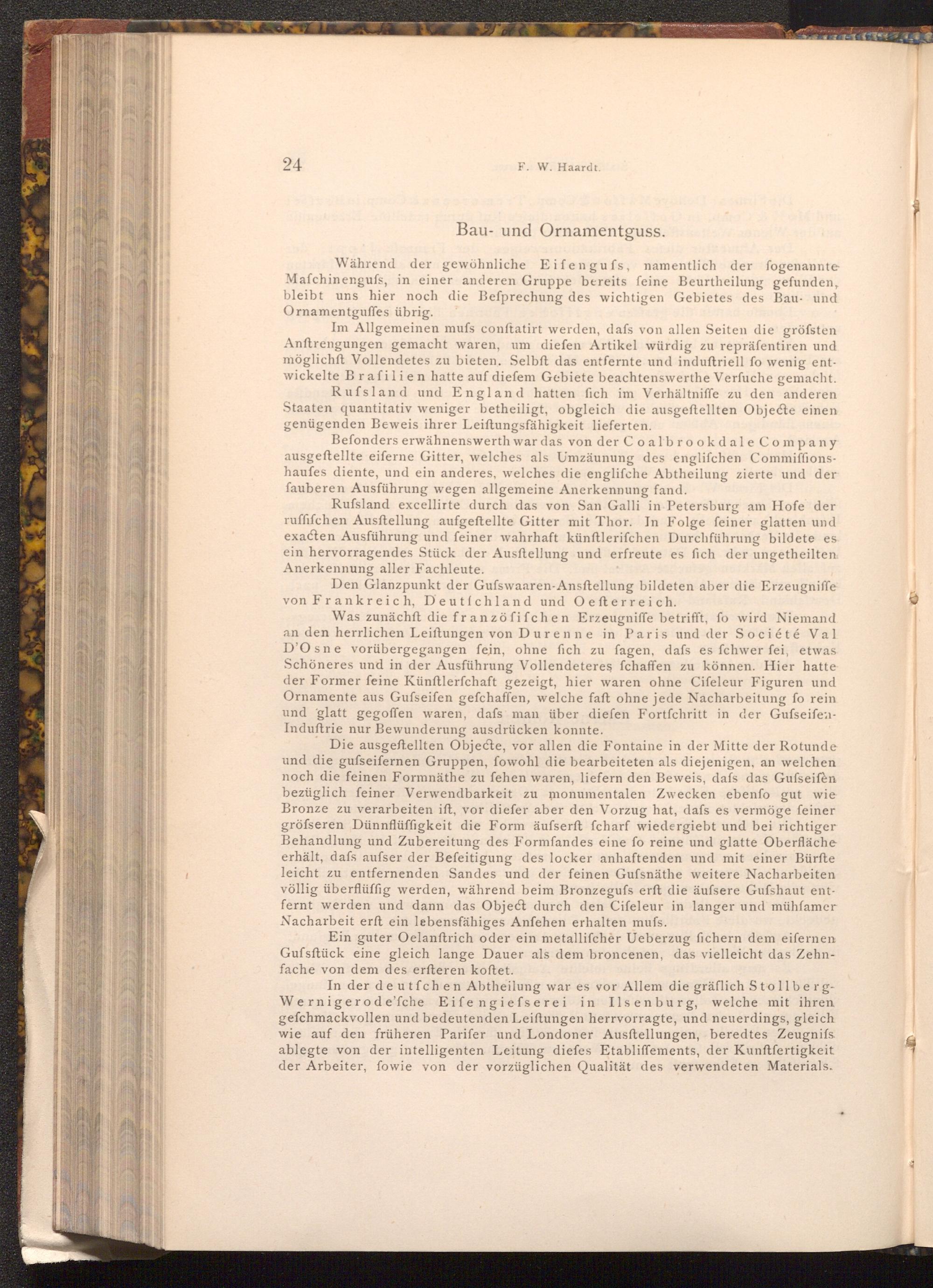 Was zunächft die franzöfifchen Erzeugniffe betrifft, fo wird Niemand. an den herrlichen Leiftungen von Durenne in Paris und der Société Val D'Osne vorübergegangen fein, ohne fich zu fagen, dafs es fchwer fei, etwas Schöneres und in der Ausführung Vollendeteres fchaffen zu können. Hier hatte der Former feine Künftlerfchaft gezeigt, hier waren ohne Cifeleur Figuren und Ornamente aus Gufseifen gefchaffen, welche faft ohne jede Nacharbeitung fo rein und glatt gegoffen waren, dafs man über diefen Fortfchritt in der GufseifenInduftrie nur Bewunderung ausdrücken konnte.