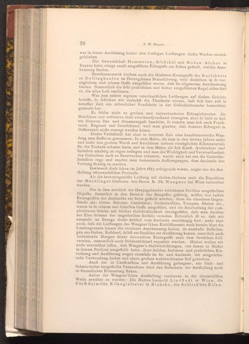 Aufser der Waagner'fchen Ausftellung verdienen in der ehrenvollften Weife erwähnt zu werden: Die Herren Leopold Lindftedt in Wien, die Fürft Salm'fche Eifengiefserei in Blansko, die Schlick'fche Eifen