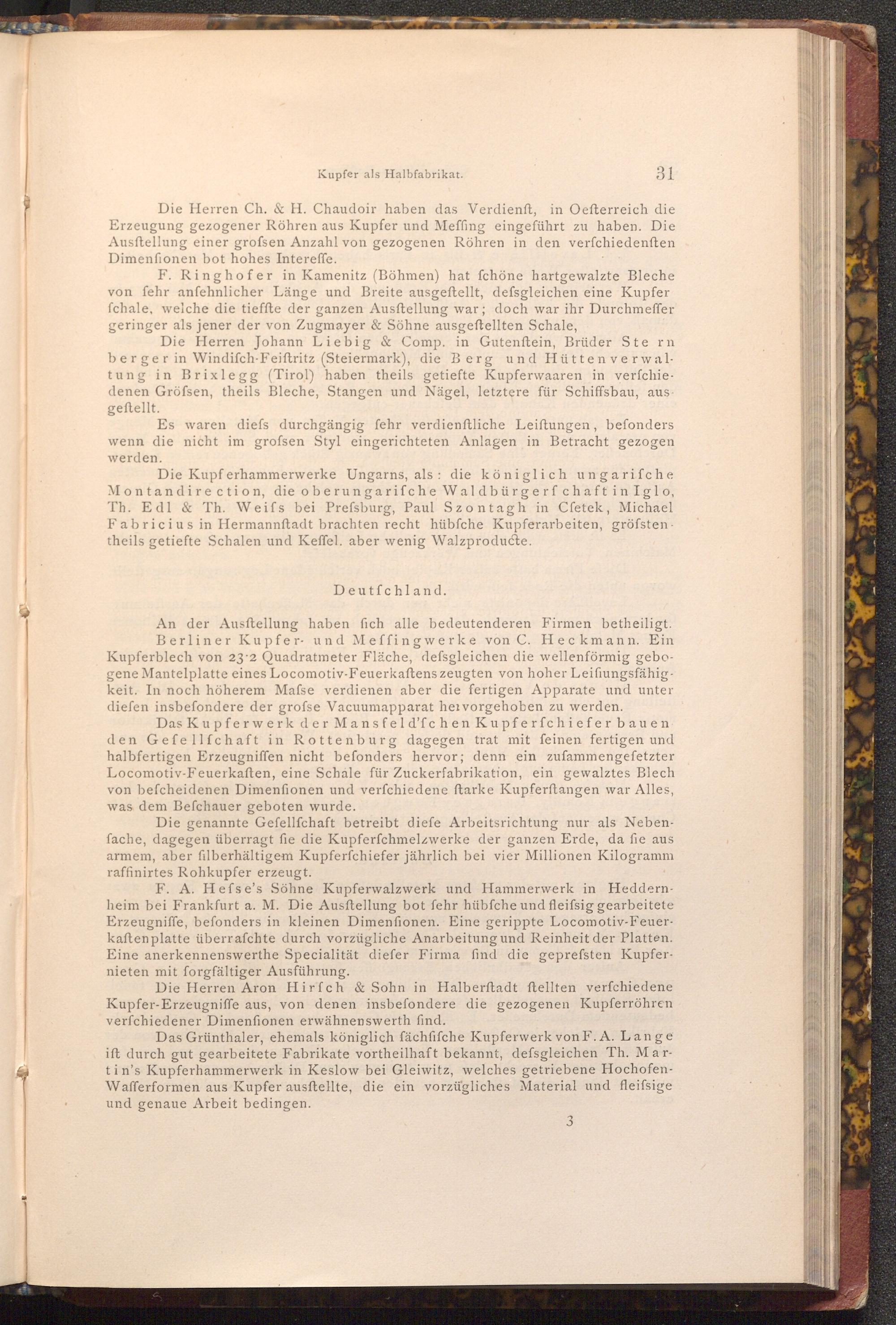 Die Herren Aron Hirfch& Sohn in Halberstadt ftellten verfchiedene Kupfer- Erzeugniffe aus, von denen insbefondere die gezogenen Kupferröhren verfchiedener Dimenfionen erwähnenswerth find.