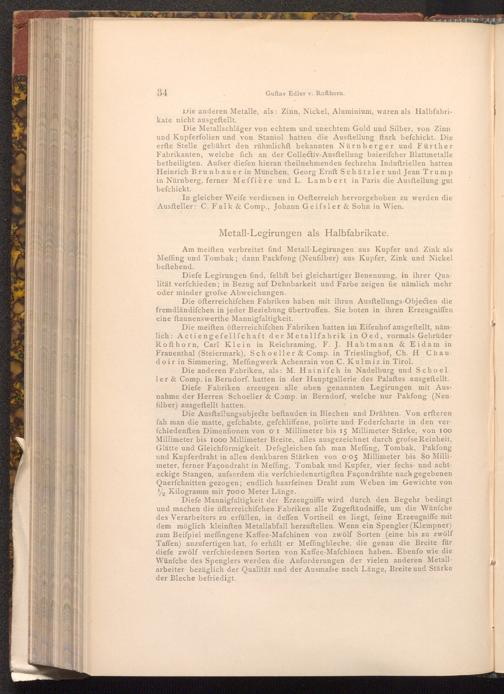 Die Ausftellungsobjecte beftanden in Blechen und Drähten. Von erfteren fah man die matte, gefchabte, gefchliffene, polirte und Federfcharte in den ver fchiedenften Dimenfionen von o'I Millimeter bis 15 Millimeter Stärke, von 100 Millimeter bis 1000 Millimeter Breite, alles ausgezeichnet durch grofse Reinheit, Glätte und Gleichförmigkeit. Defsgleichen fah man Meffing, Tombak, Pakfong und Kupferdraht in allen denkbaren Stärken von o'05 Millimeter bis 80 Millimeter, ferner Façondraht in Meffing, Tombak und Kupfer, vier fechs- und achteckige Stangen, aufserdem die verfchiedenartigften Façondrähte nach gegebenen Querfchnitten gezogen; endlich haarfeinen Draht zum Weben im Gewichte von 12 Kilogramm mit 7000 Meter Länge.