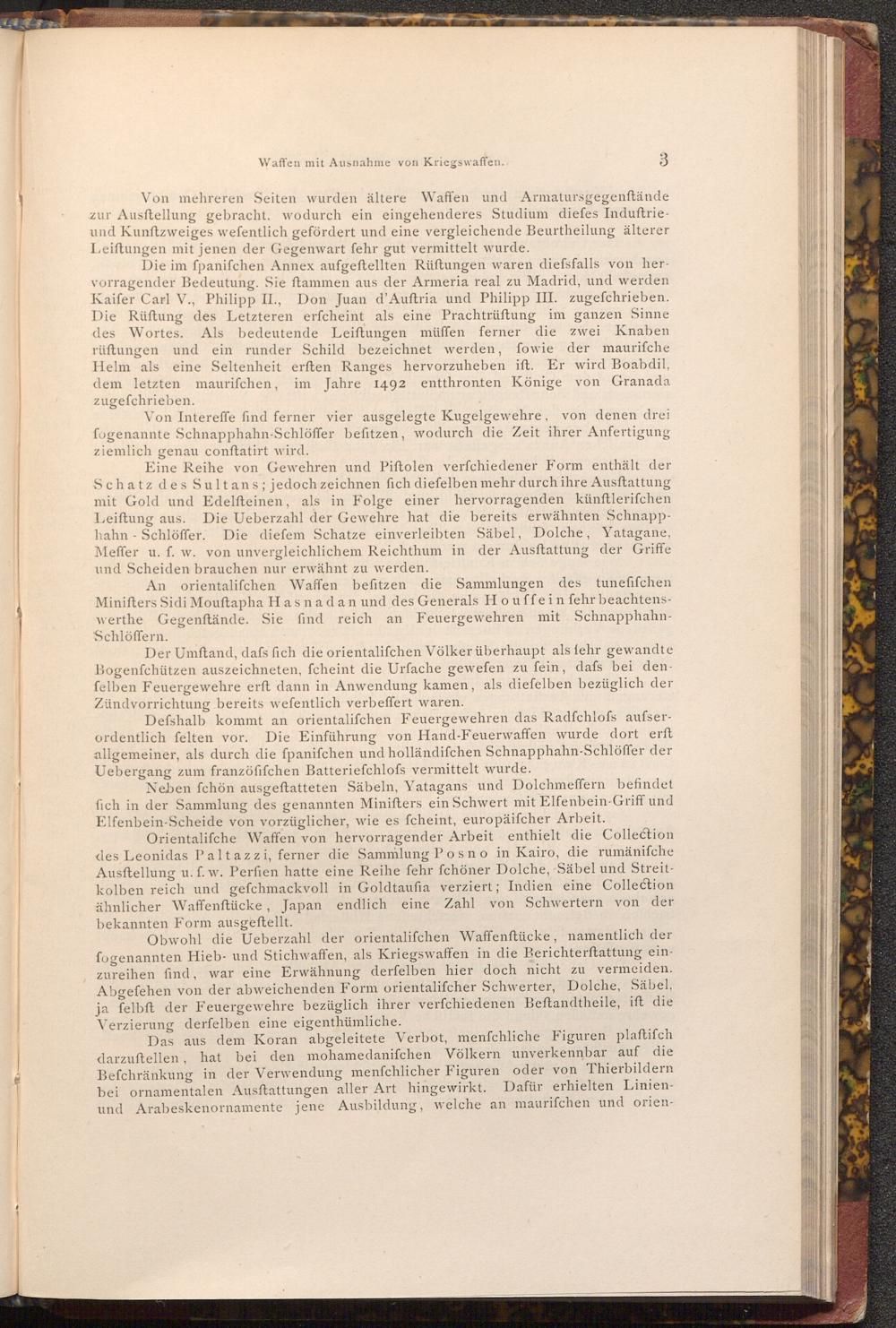 Die im fpanifchen Annex aufgeftellten Rüftungen waren diefsfalls von hervorragender Bedeutung. Sie ftammen aus der Armeria real zu Madrid, und werden Kaifer Carl V., Philipp II., Don Juan d'Auftria und Philipp III. zugefchrieben. Die Rüftung des Letzteren erfcheint als eine Prachtrüftung im ganzen Sinne des Wortes. Als bedeutende Leiftungen müffen ferner die zwei Knaben rüftungen und ein runder Schild bezeichnet werden, fowie der maurifche Helm als eine Seltenheit erften Ranges hervorzuheben ift. Er wird Boabdil, dem letzten maurifchen, im Jahre 1492 entthronten Könige von Granada zugefchrieben.