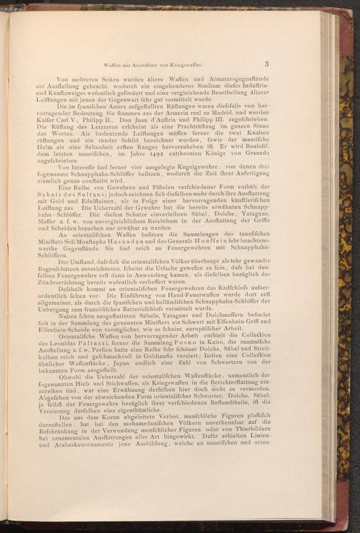 Obwohl die Ueberzahl der orientalifchen Waffenftücke, namentlich der fogenannten Hieb- und Stichwaffen, als Kriegswaffen in die Berichterstattung einzureihen find, war eine Erwähnung derfelben hier doch nicht zu vermeiden. Abgefehen von der abweichenden Form orientalifcher Schwerter, Dolche, Säbel, ja felbft der Feuergewehre bezüglich ihrer verfchiedenen Beftandtheile, ift die Verzierung derfelben eine eigenthümliche.