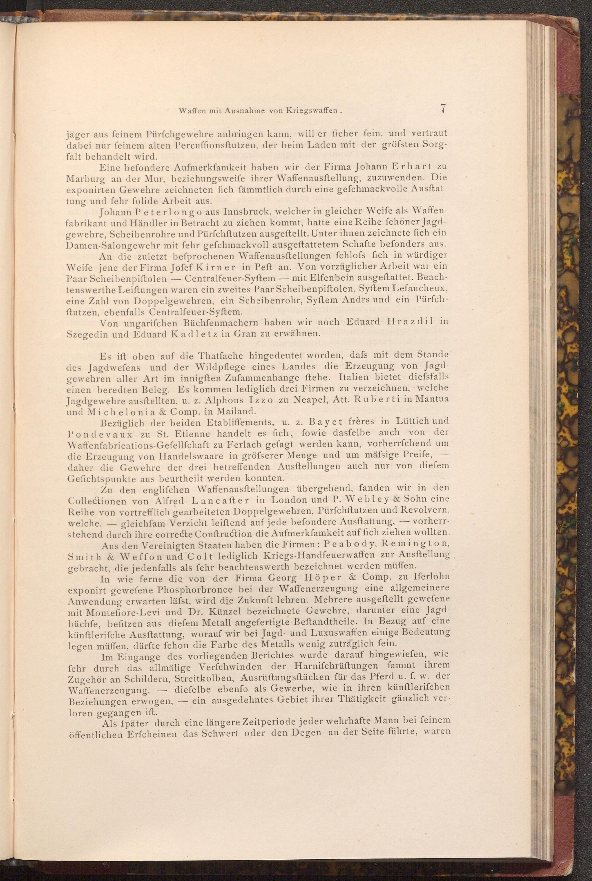 Johann Peterlongo aus Innsbruck, welcher in gleicher Weife als Waffenfabrikant und Händler in Betracht zu ziehen kommt, hatte eine Reihe fchöner Jagdgewehre, Scheibenrohre und Pürfchftutzen ausgeftellt. Unter ihnen zeichnete fich ein Damen- Salongewehr mit fehr gefchmackvoll ausgeftattetem Schafte befonders aus.